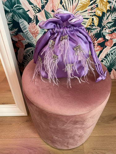 Candy Bag Raso Lilla Ciuffi Piuma Lilla e Cristalli