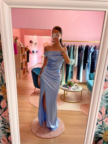 Abito Maxi Scollo Dritto e Sciarpetta Blu Floreale