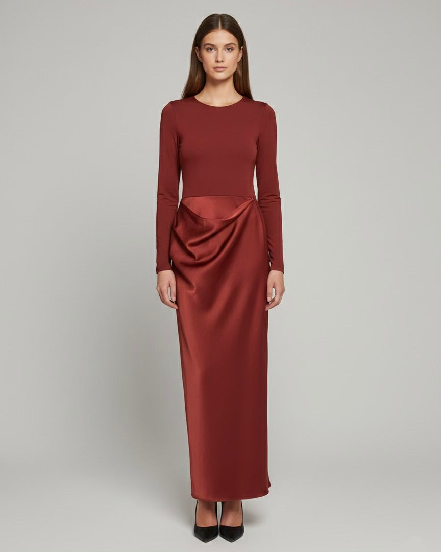 Burgundy dress consisting of a long-sleeved Lycra bodysuit and a satin skirt with draped detail and side zip.