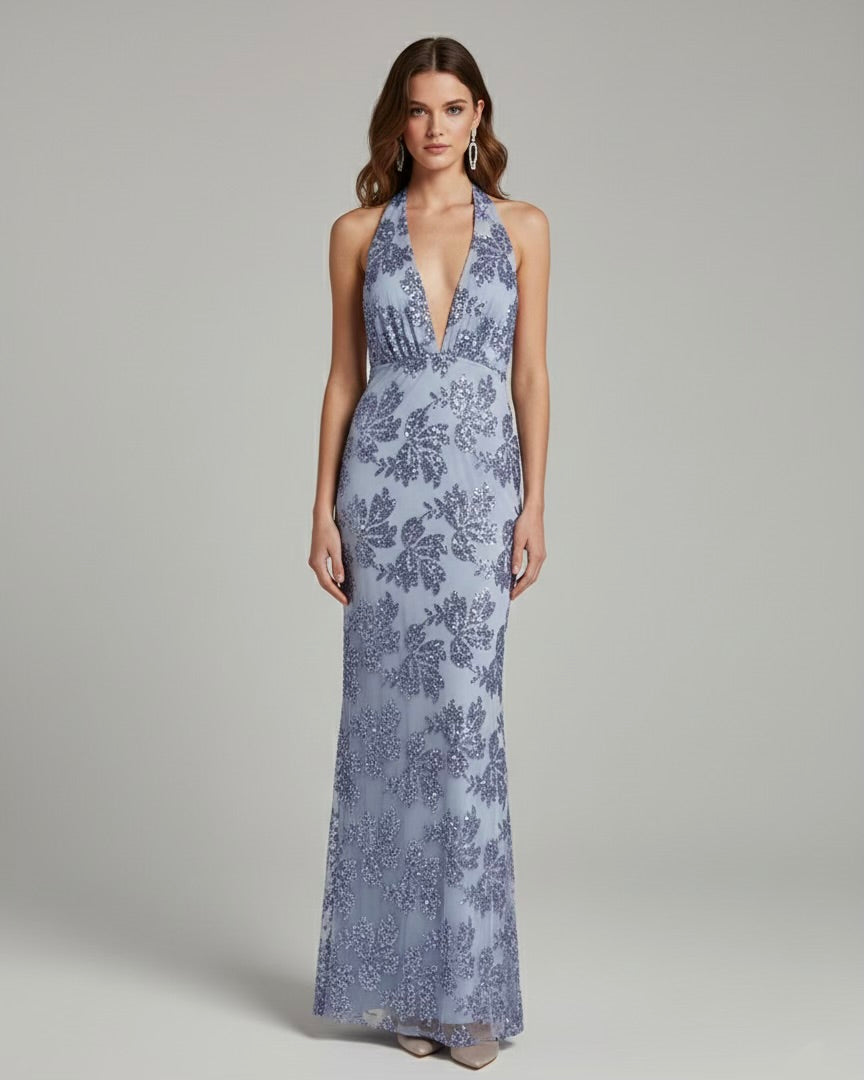 Pastel blue mermaid-style maxi dress with micro sequins. Stretch fabric. Plunging neckline with lace-up closure. Backless.
