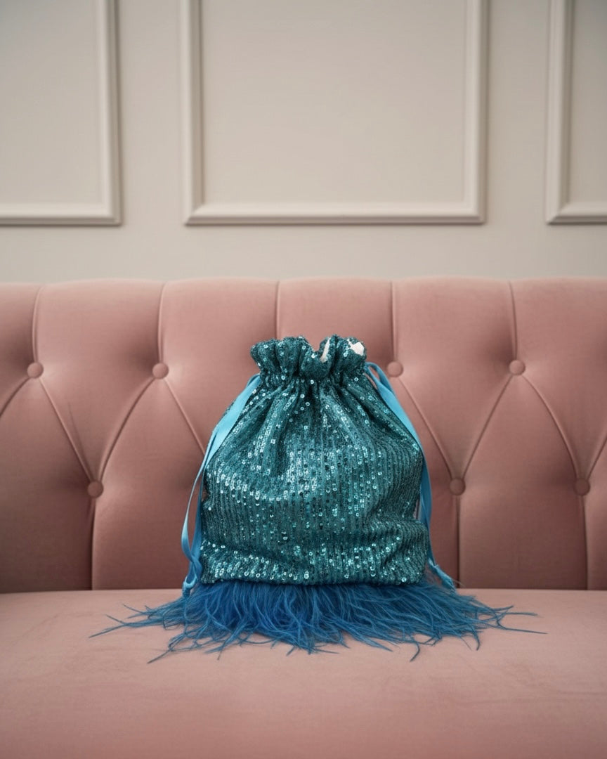 Medium handbag with turquoise sequins on the outside and white cotton lining, handmade; turquoise ostrich feather boa and turquoise satin handles. Perfect for completing your formal outfit.