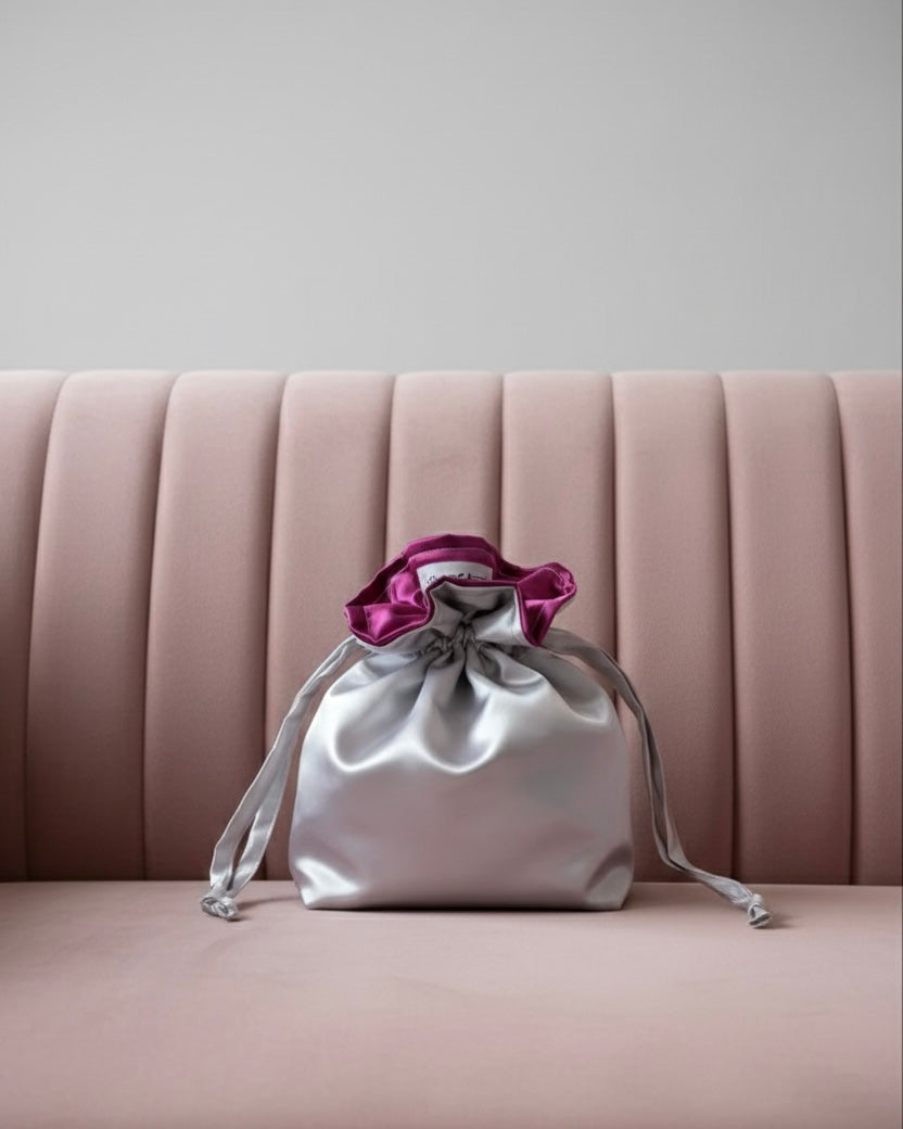 Medium-sized satin bag with a silver exterior and mauve interior. Silver satin handles. Perfect for completing your formal outfit.