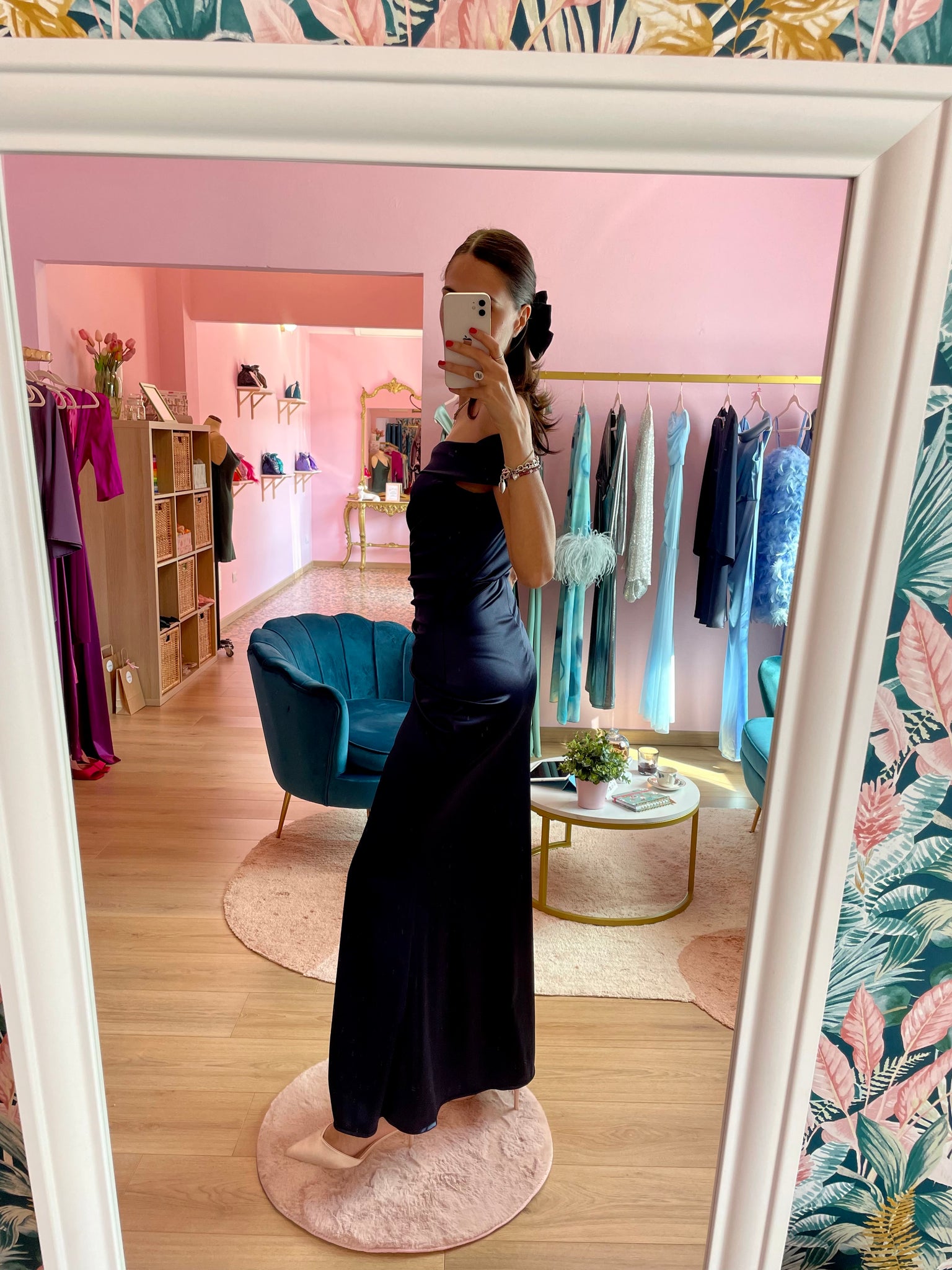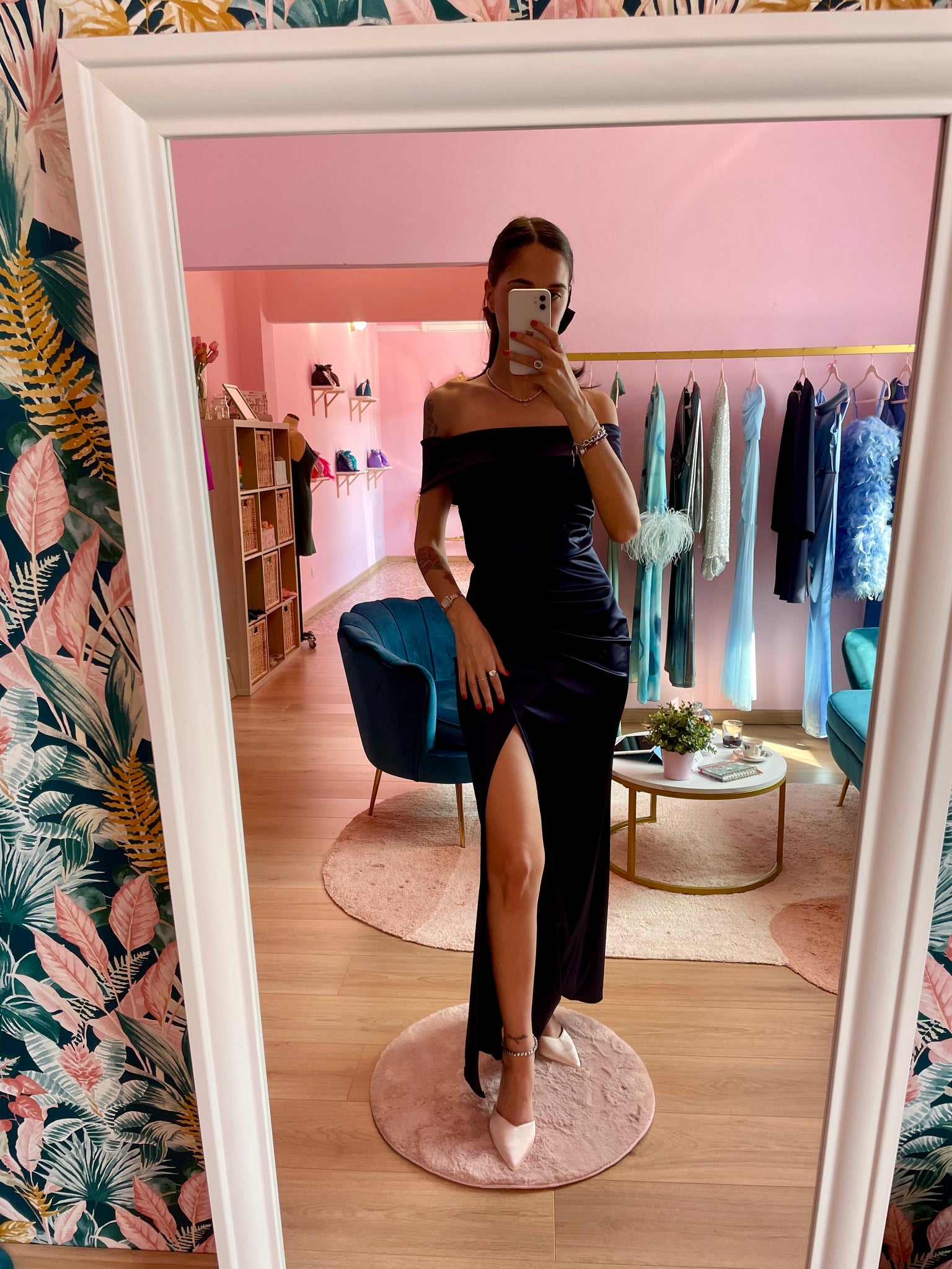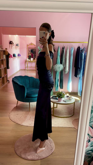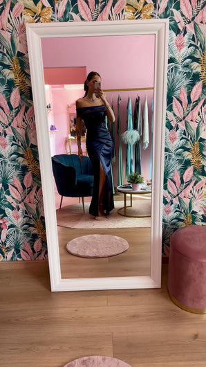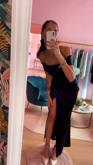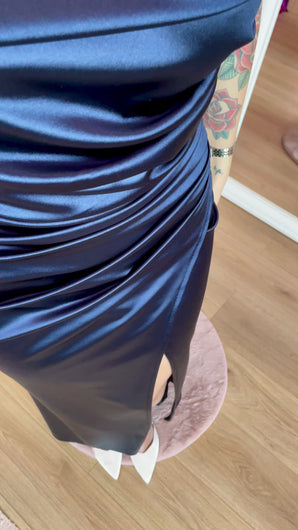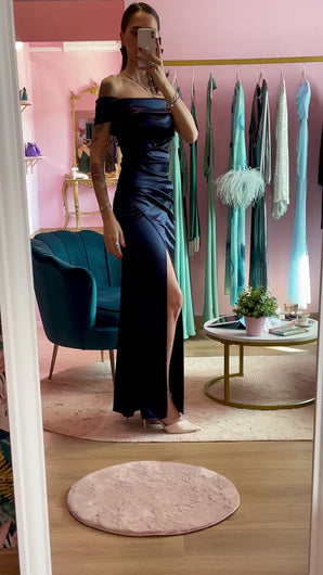 Abito aderente blu notte in raso con gioco di drappeggi. Spacco frontale, scollo bardot, zip sul retro e imbottitura sul seno.
