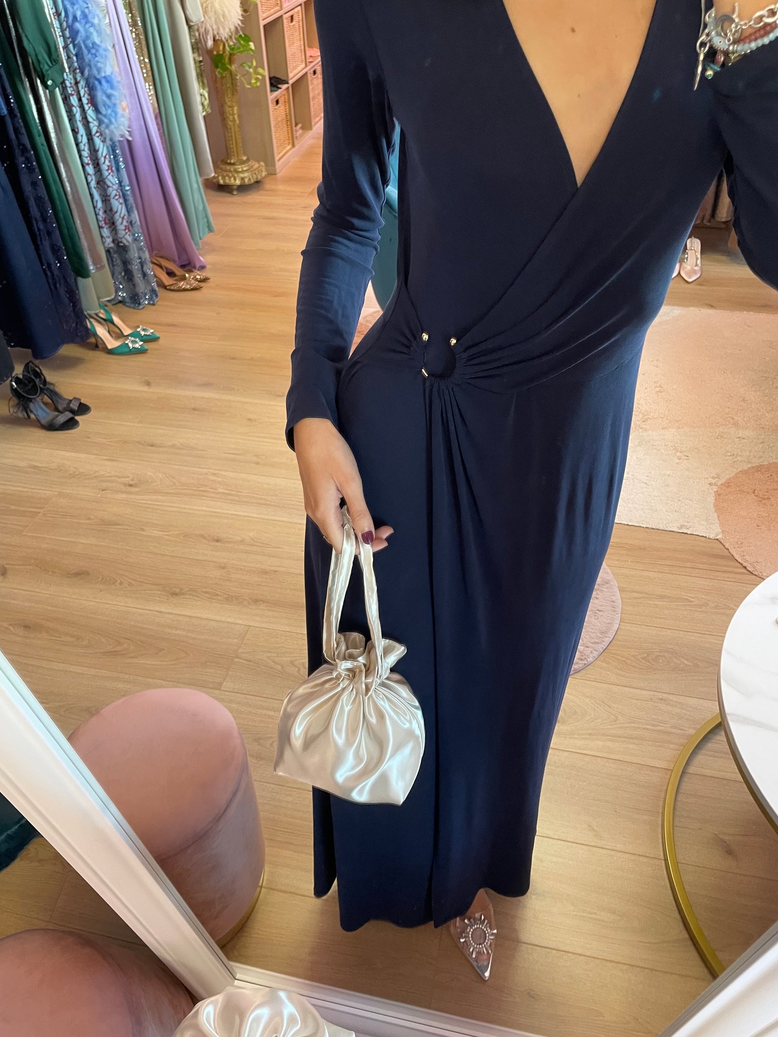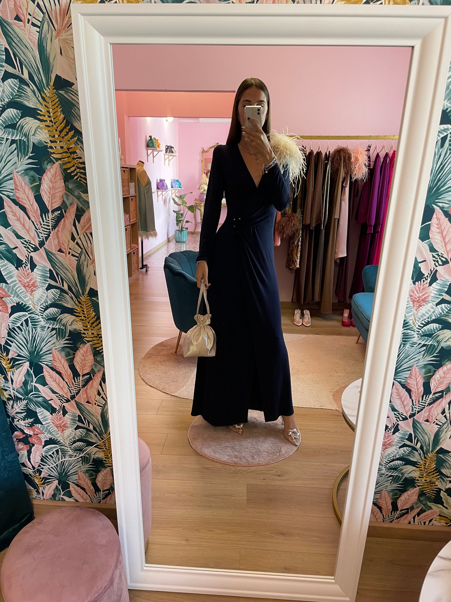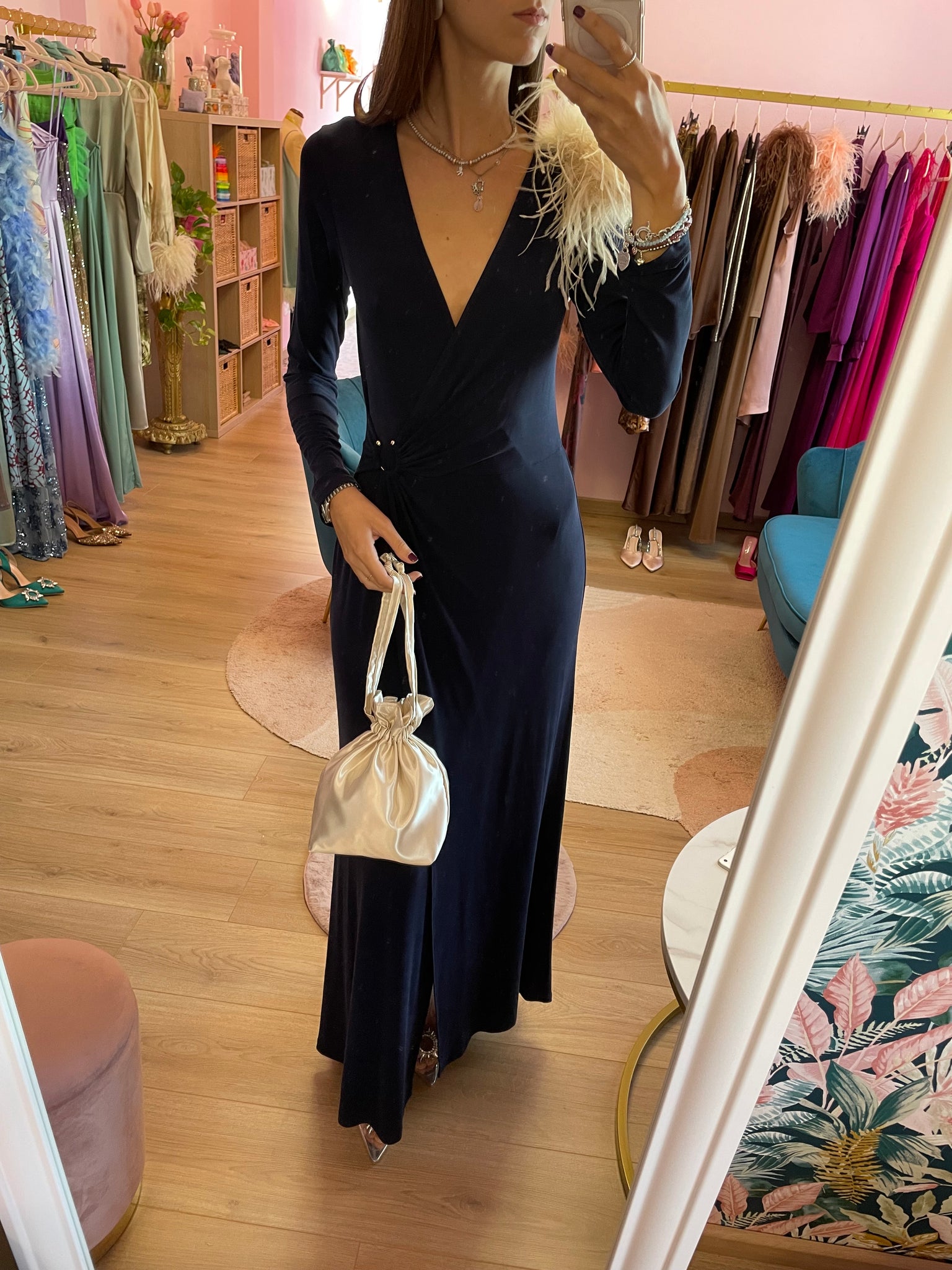 Abito maxi in morbida viscosa, elasticizzato, con dettaglio semi anello sul davanti. Stile modello portafoglio. Dettaglio boa in piume di struzzo cucita su una spalla a contrasto color champagne. Possibilità di rimozione del boa tramite asolina e bottoncino. Consigliata la rimozione per il lavaggio.