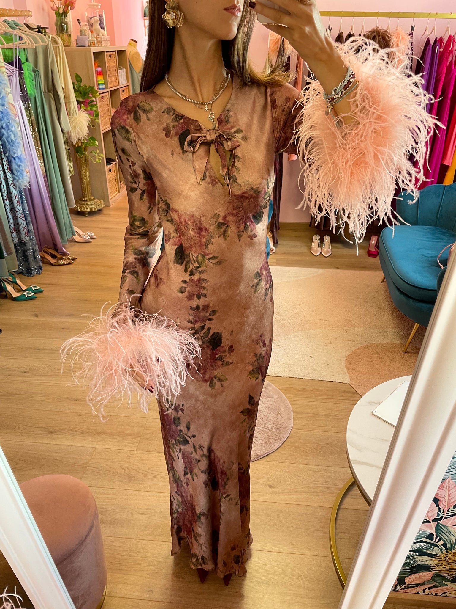 Abito maxi con maniche lunghe in morbida viscosa, stampa floreale sui toni del rosa, bordeaux, marrone e beige. Boa in piume di struzzo cucite a mano con possibilità di rimozione tramite asoline e bottoncini. Consigliata la rimozione per il lavaggio. Zip laterale e dettaglio fiocchetto sul davanti.