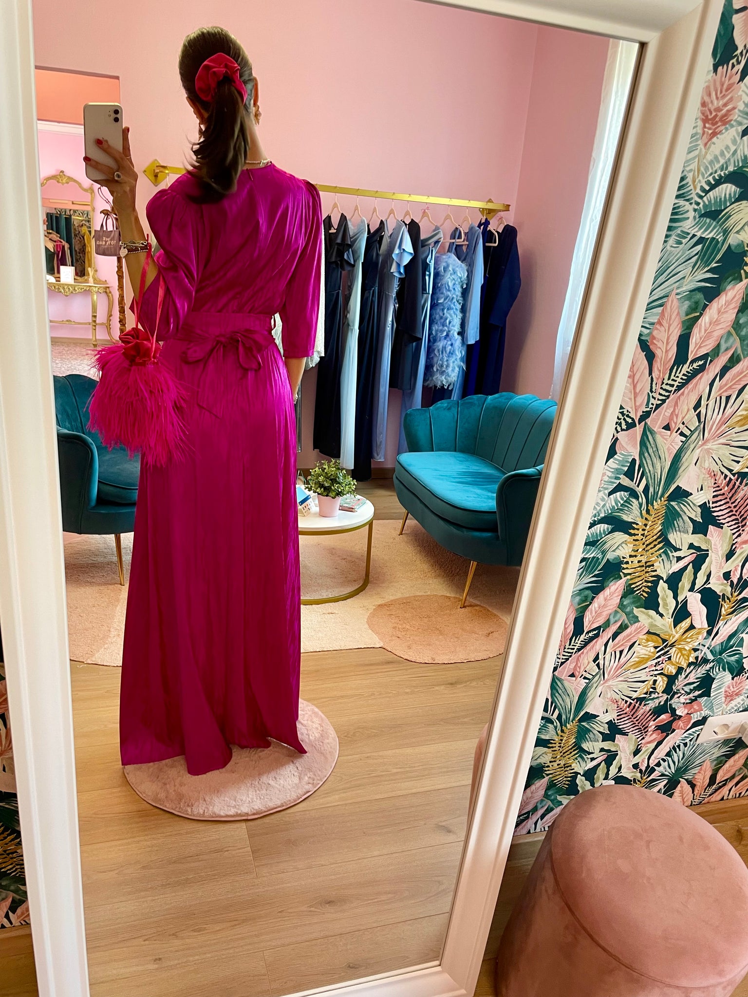 Abito maxi fucsia in raso stampa damascata. Modello a portafoglio con sottoveste e zip sul retro. Scollo a V. Maniche a 3/4 a sbuffo e cinturino lungo in vita chiusura a fiocco.
