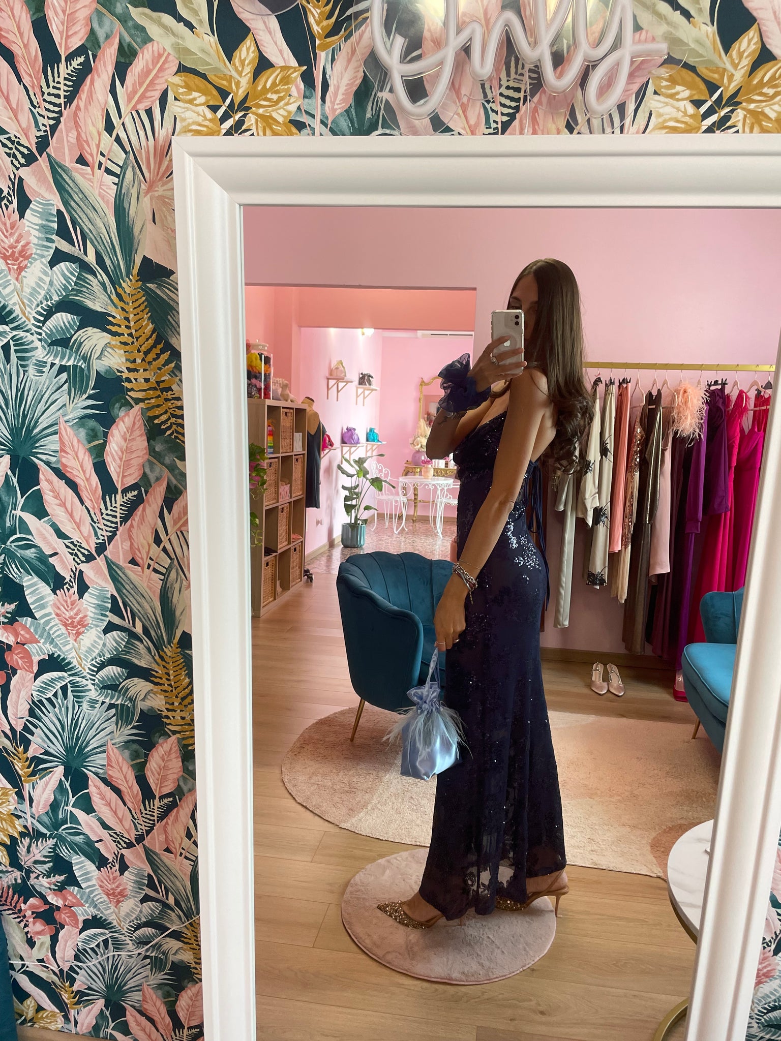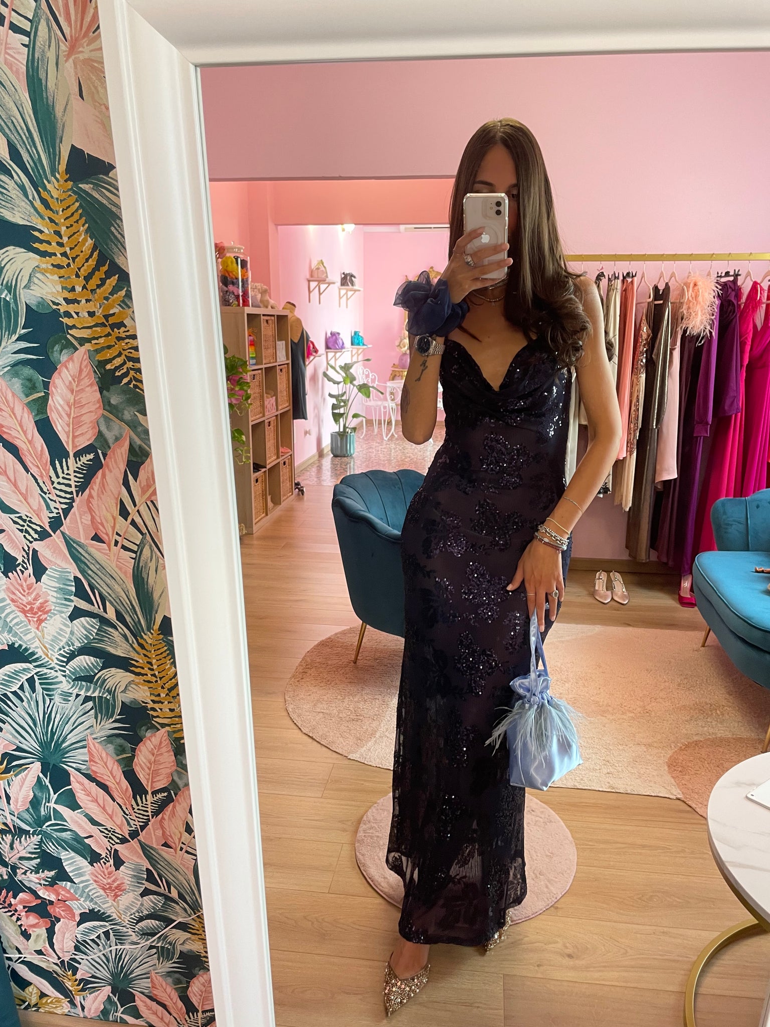 Abito maxi vedo non vedo con mini paillettes color blu notte. Scollo ad anello e spallini intrecciati sul retro. Elasticizzato e regolabile.