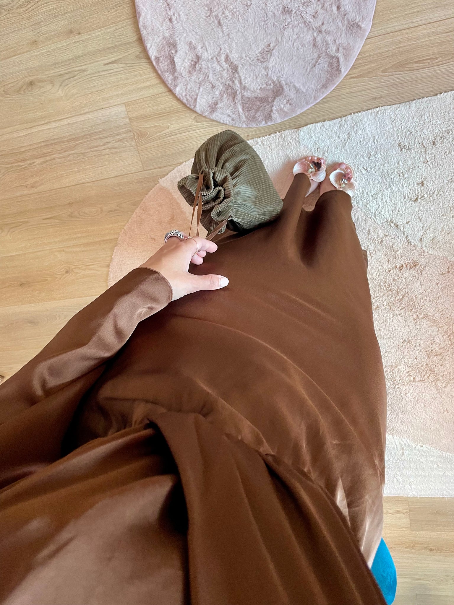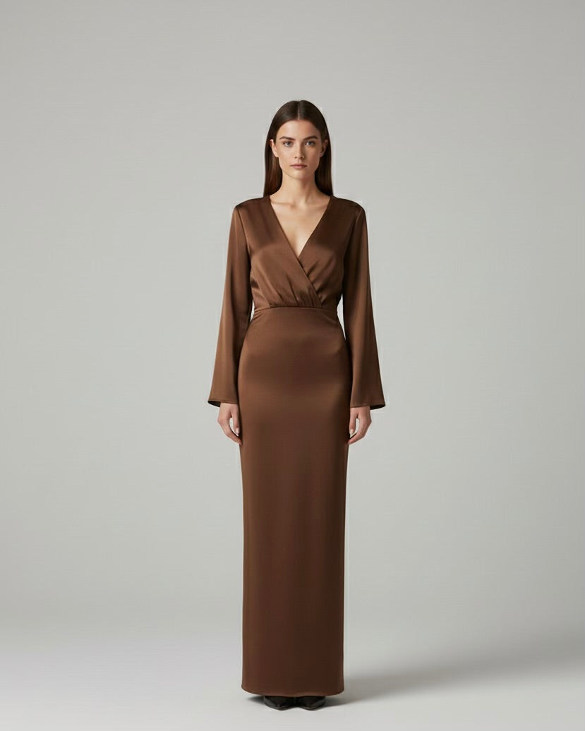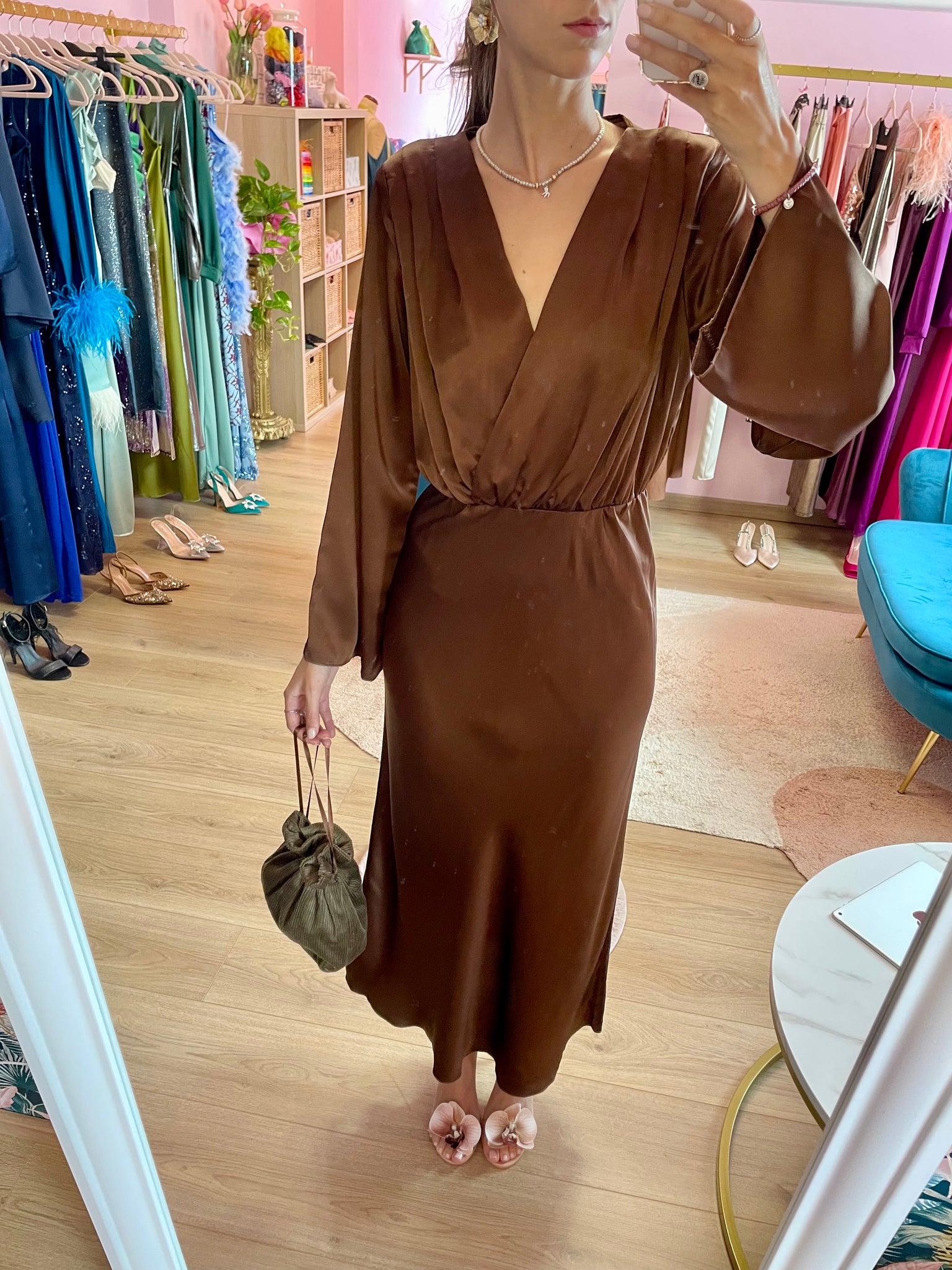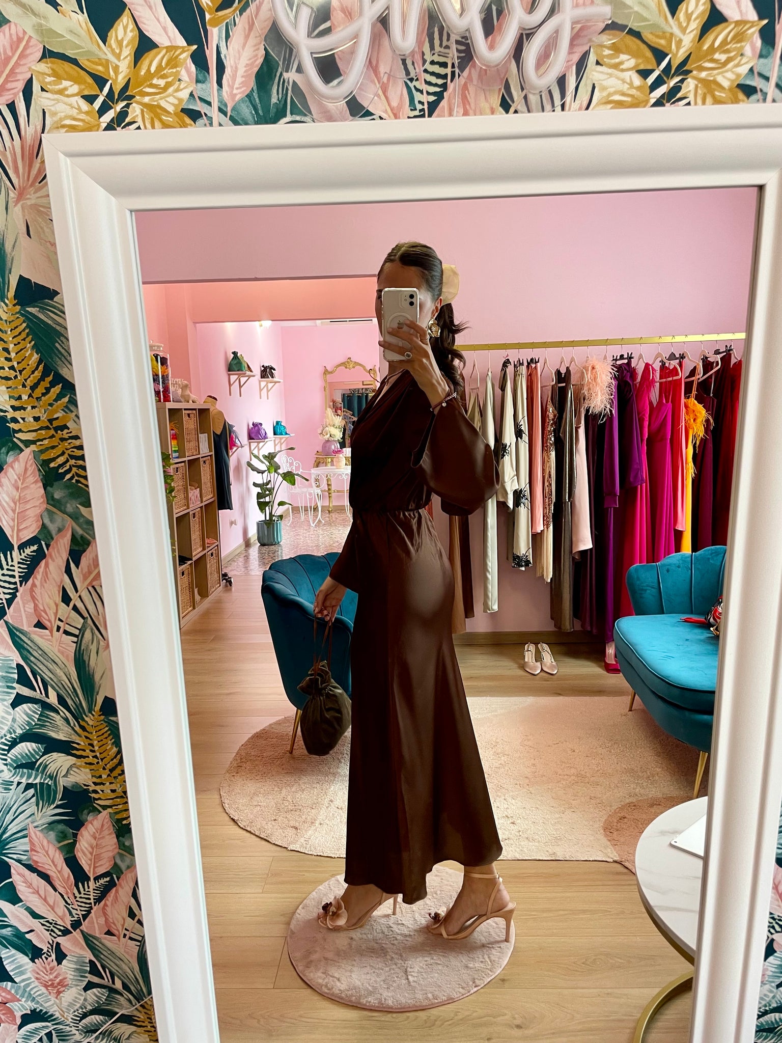 Abito maxi in raso color cioccolato. Maniche lunghe a campana. Scollo intrecciato con elastico in vita.