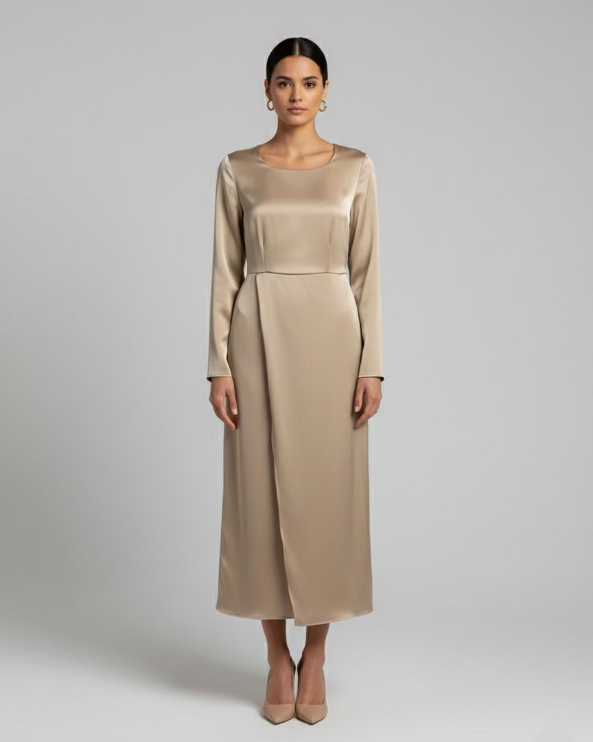 Abito maxi satin color champagne con maniche lunghe, dettaglio pareo sul davanti, spacco frontale. Zip laterale.