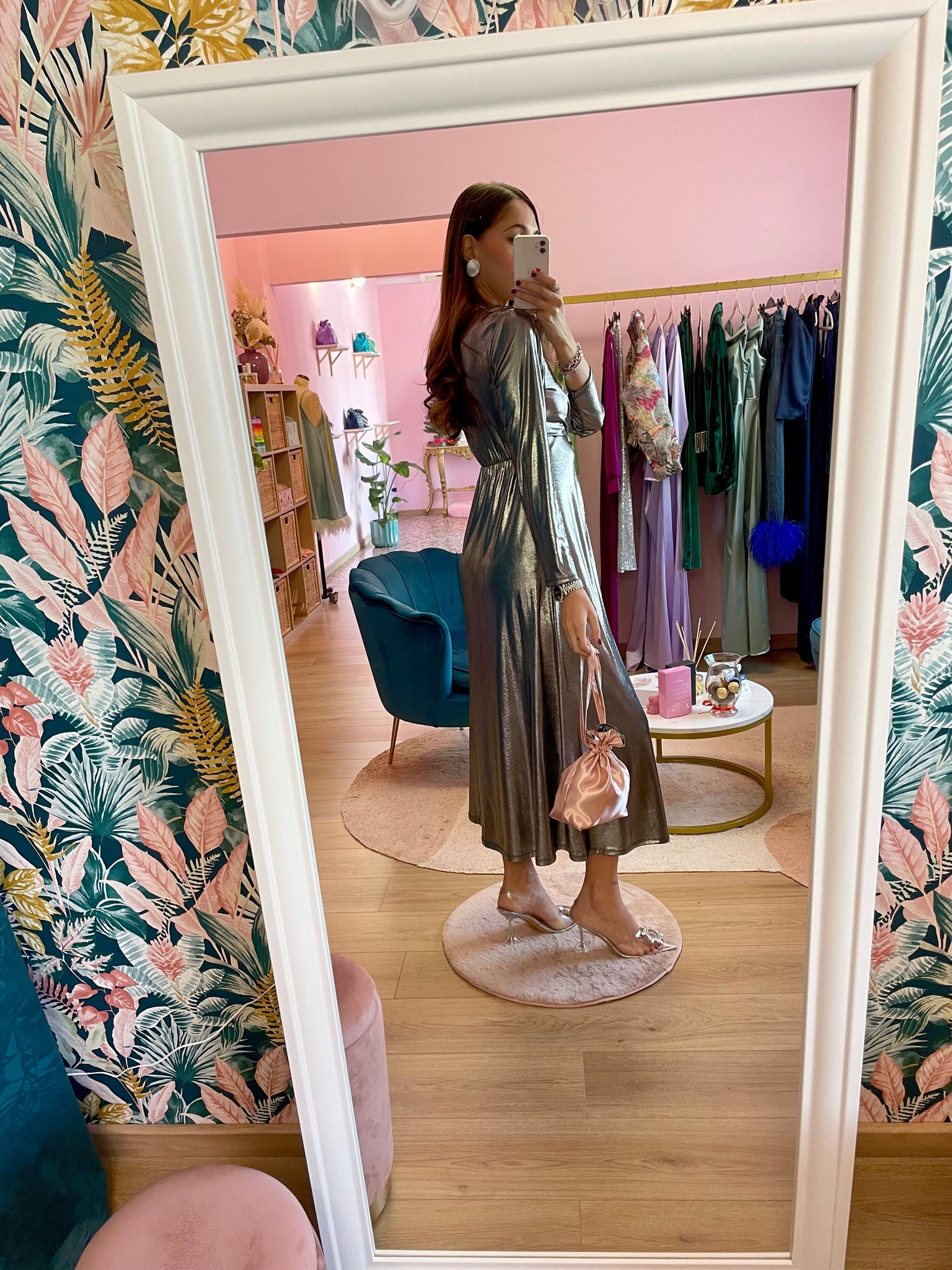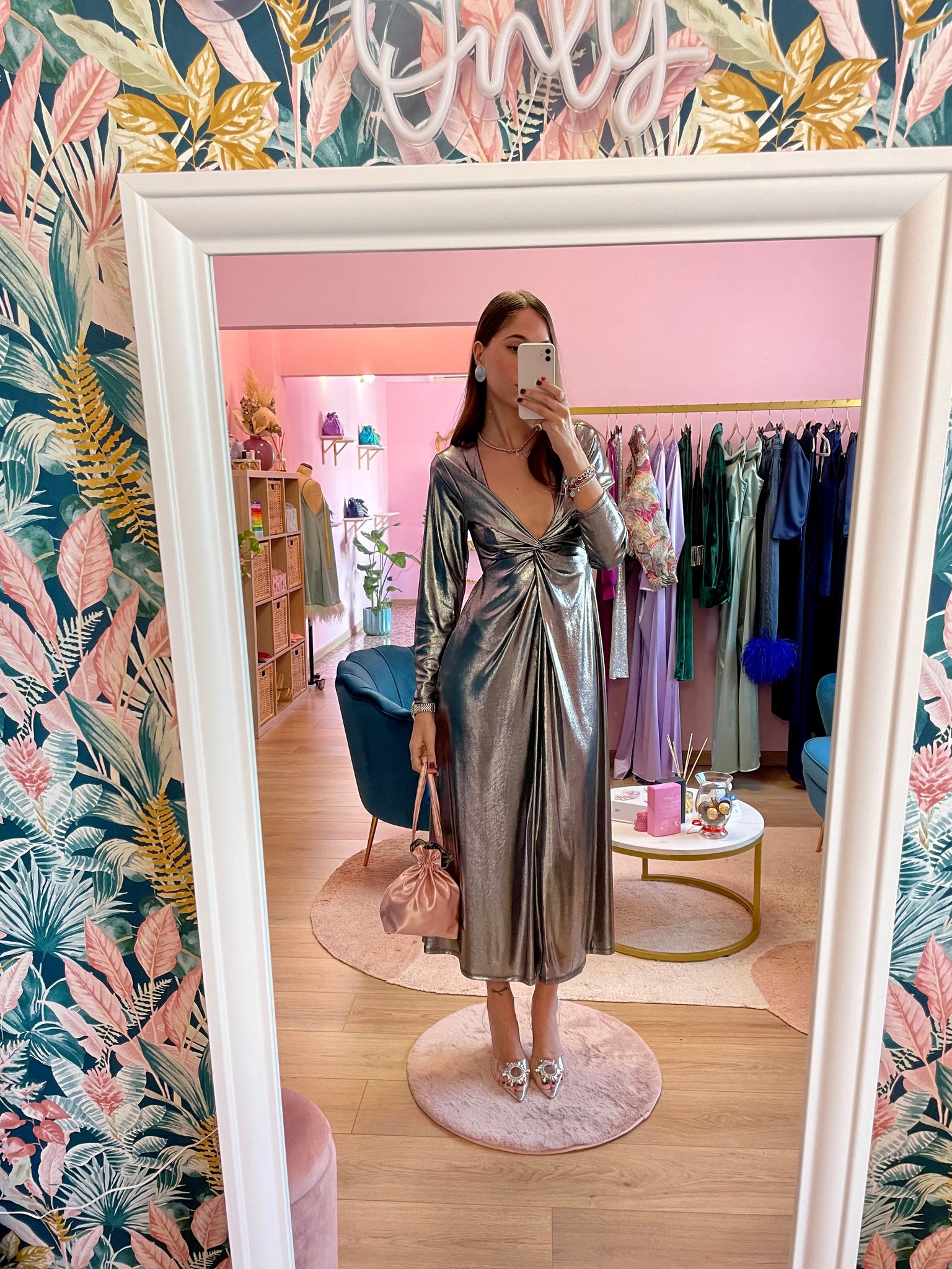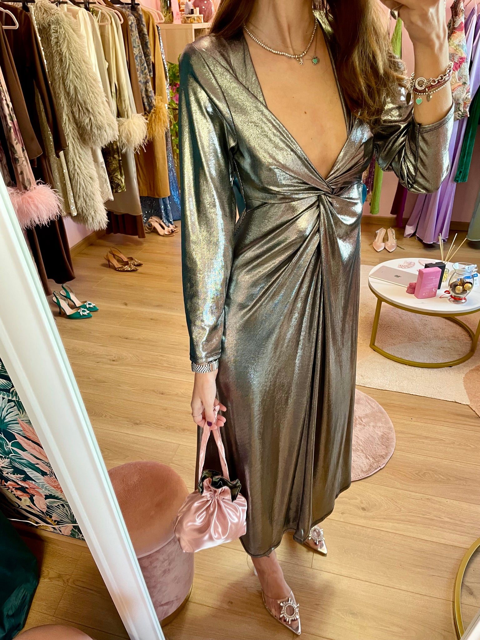 Abito maxi argentato lamè, con manica lunga, scollo profondo e nodo, elasticizzato in vita.