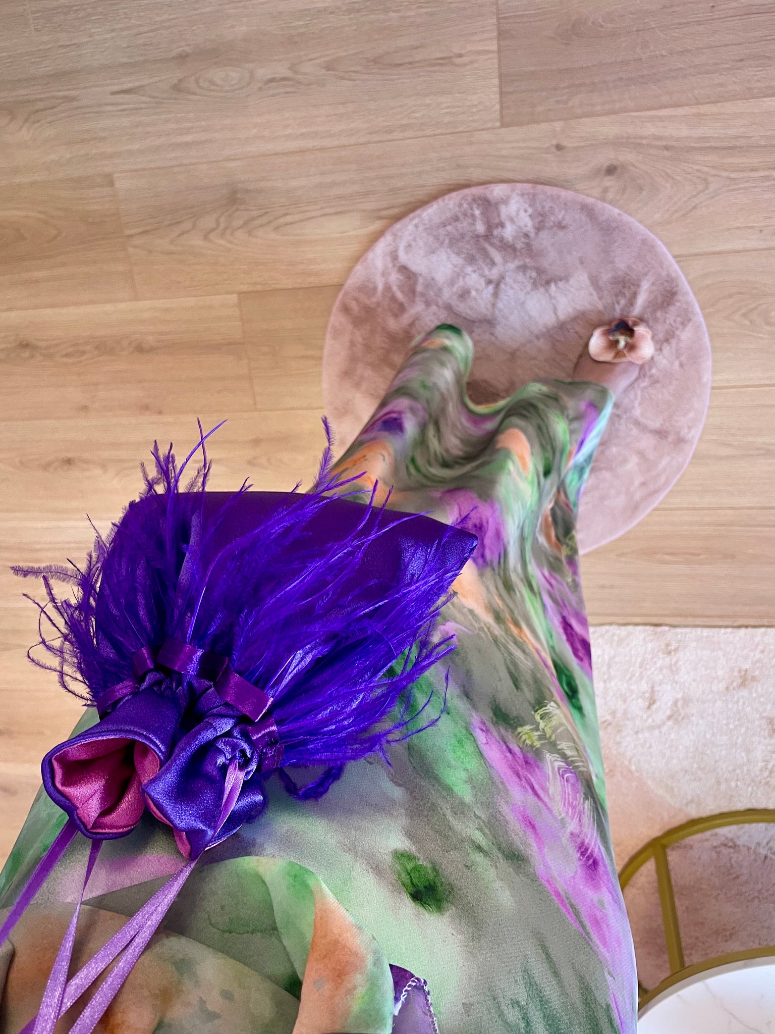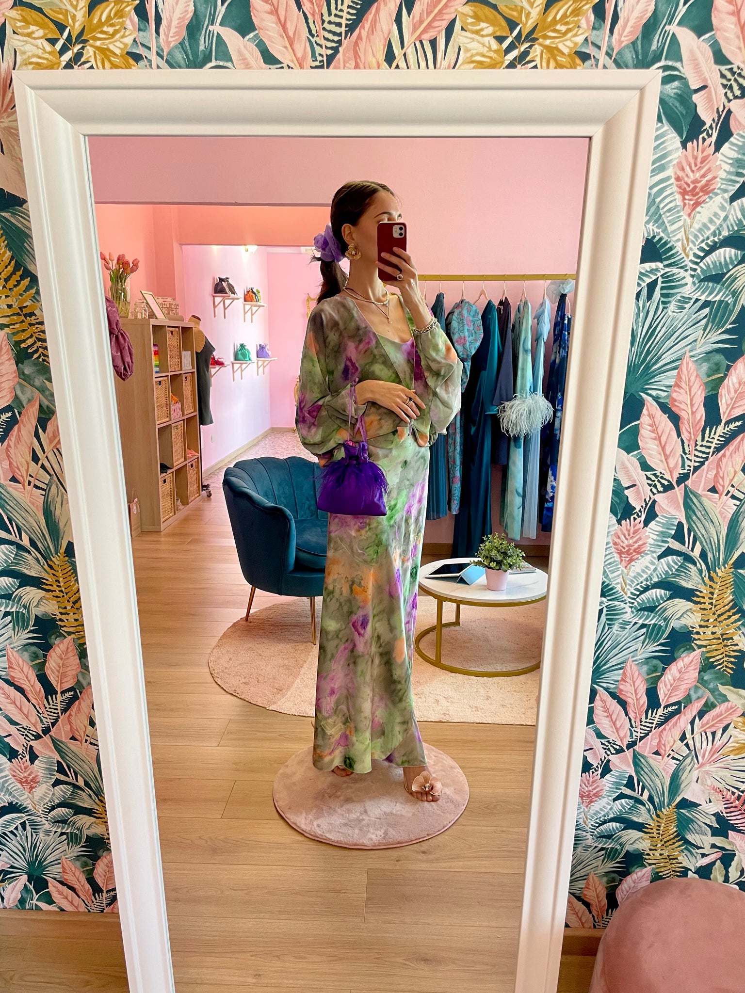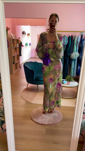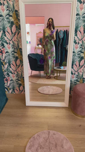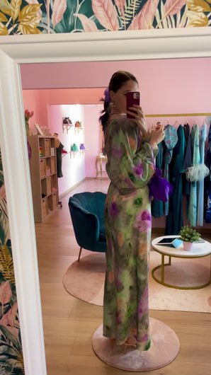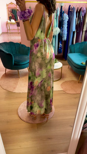 Abito maxi con spallini sottili, scollo ad anello e mantella abbinata. Stampa acquarello verde acqua e multicolor. Scollo sul retro.