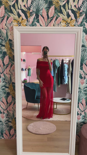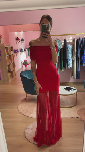 Abito maxi con tulle elastico rosso. Gioco di trasparenze. elasticizzato. Scollo removibile.