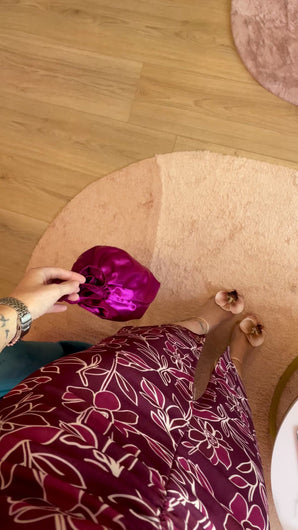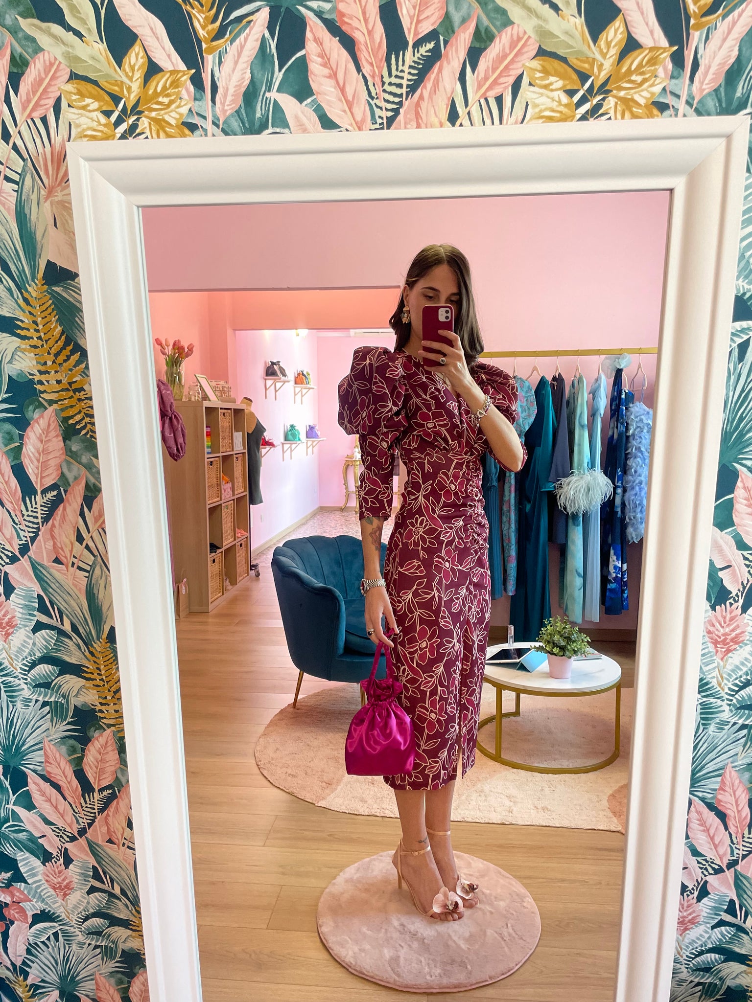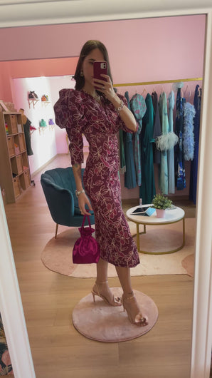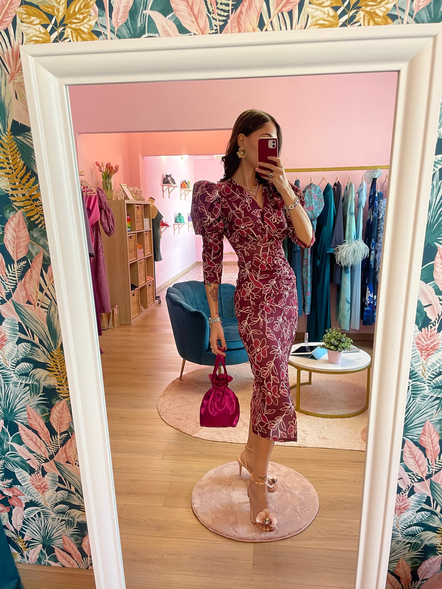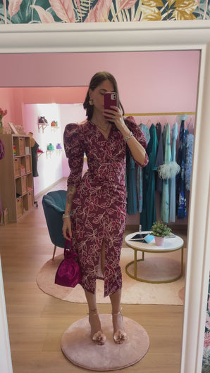 Abito midi con fantasia floreale sui toni del bordeaux e malva. Maniche a sbuffo ampie a 3/4. Spacchetto frontale. Arricciatura in vita. Scollo a V.