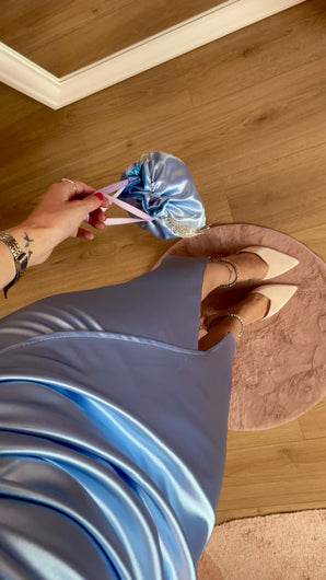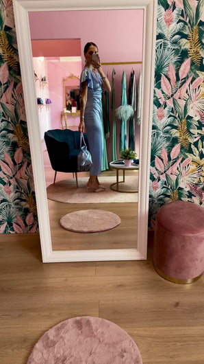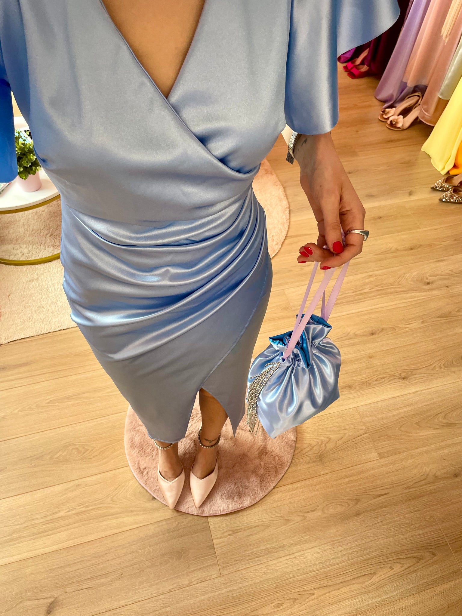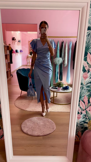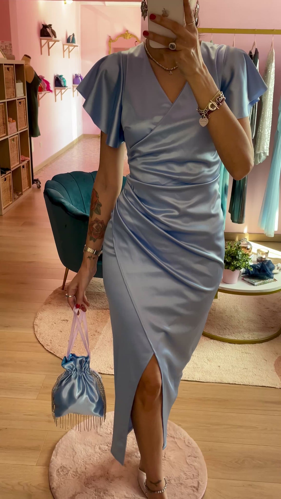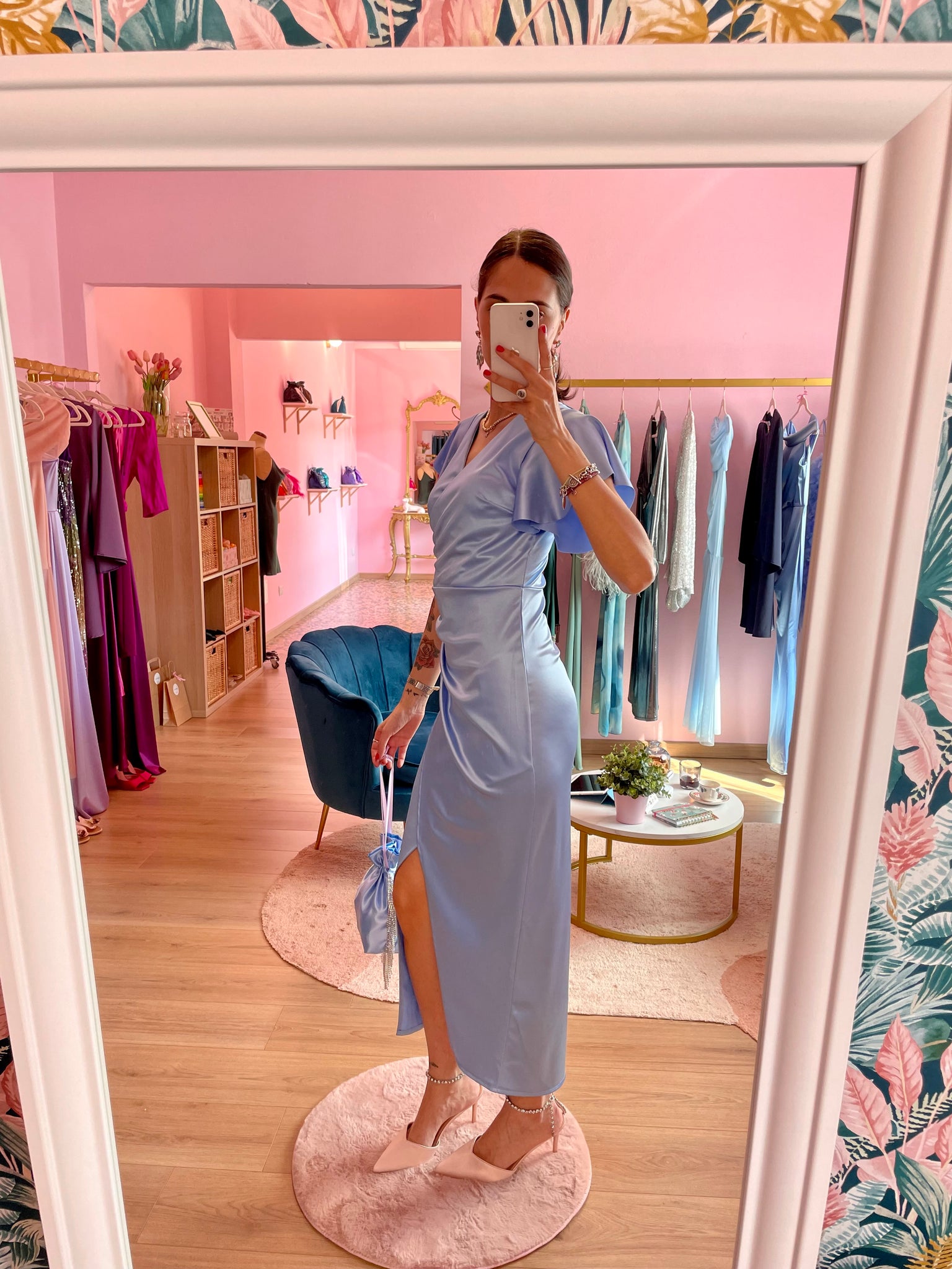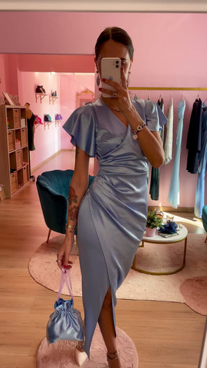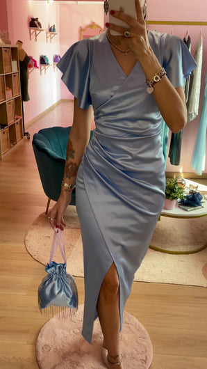 Abito midi azzurro con drappeggio sul davanti, spacco frontale, zip sul retro. Maniche corte e morbide con volant. Scollo a V e imbottitura sul seno.