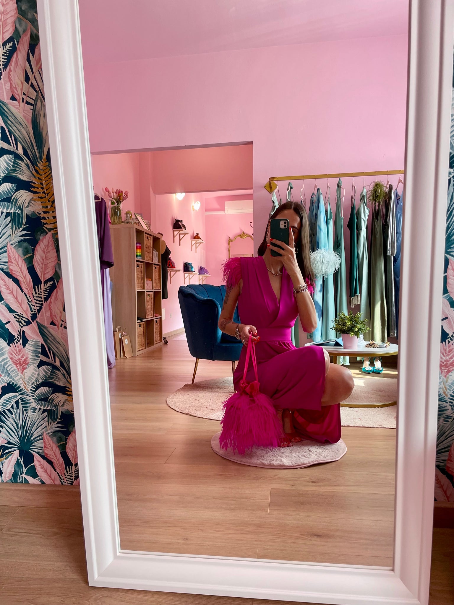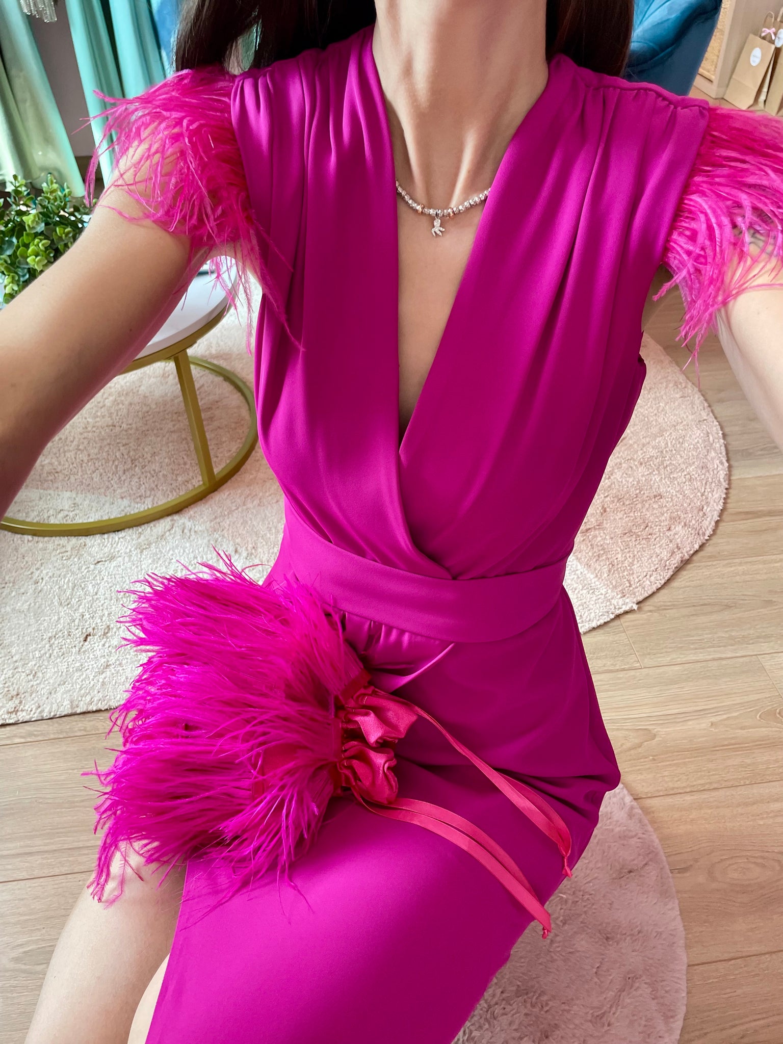 Abito midi con scollo a V color bouganville, piumette in piuma di struzzo cucite a mano in tinta. Zip sul retro. Spacco Frontale. Spalline imbottite.