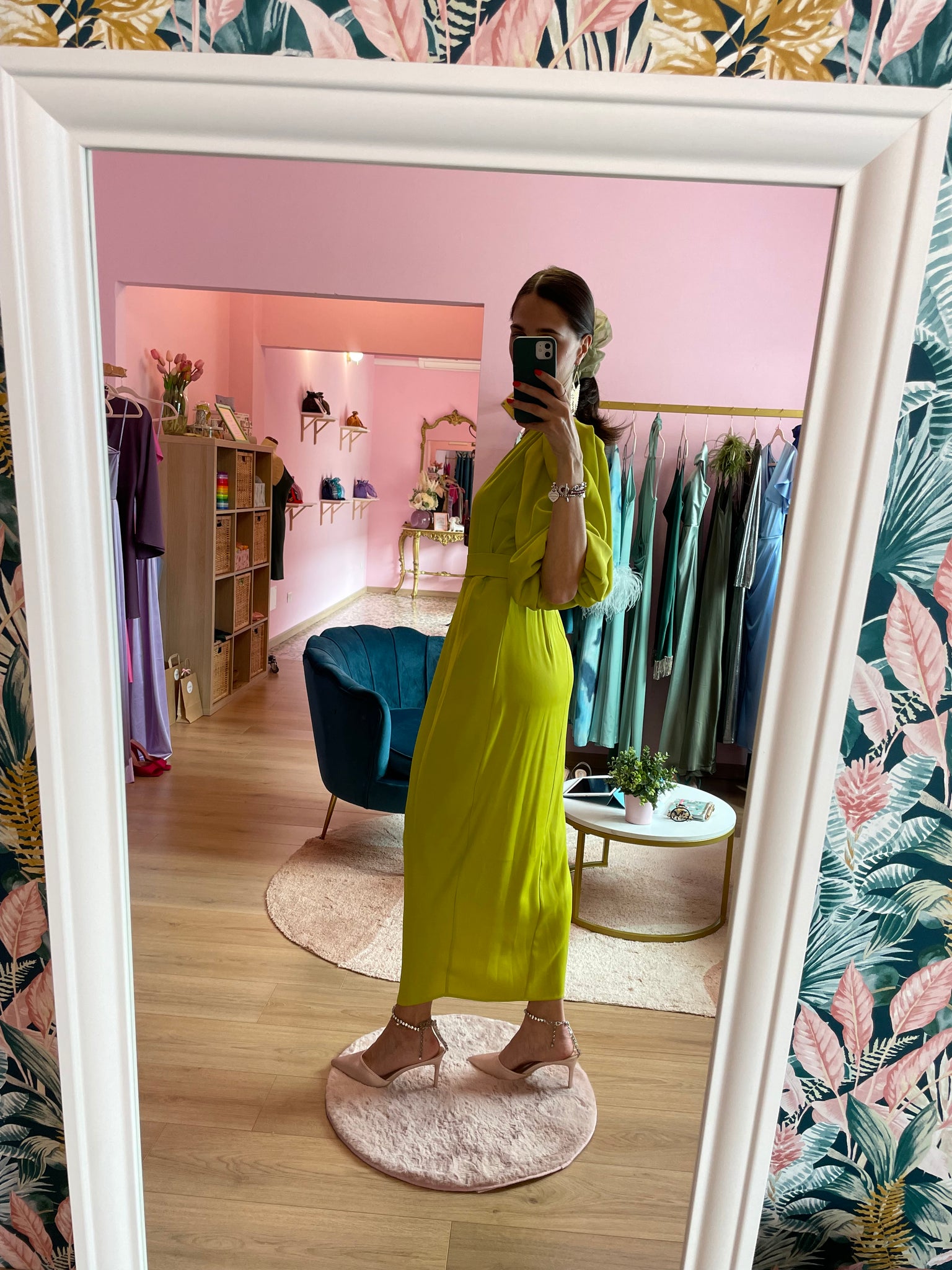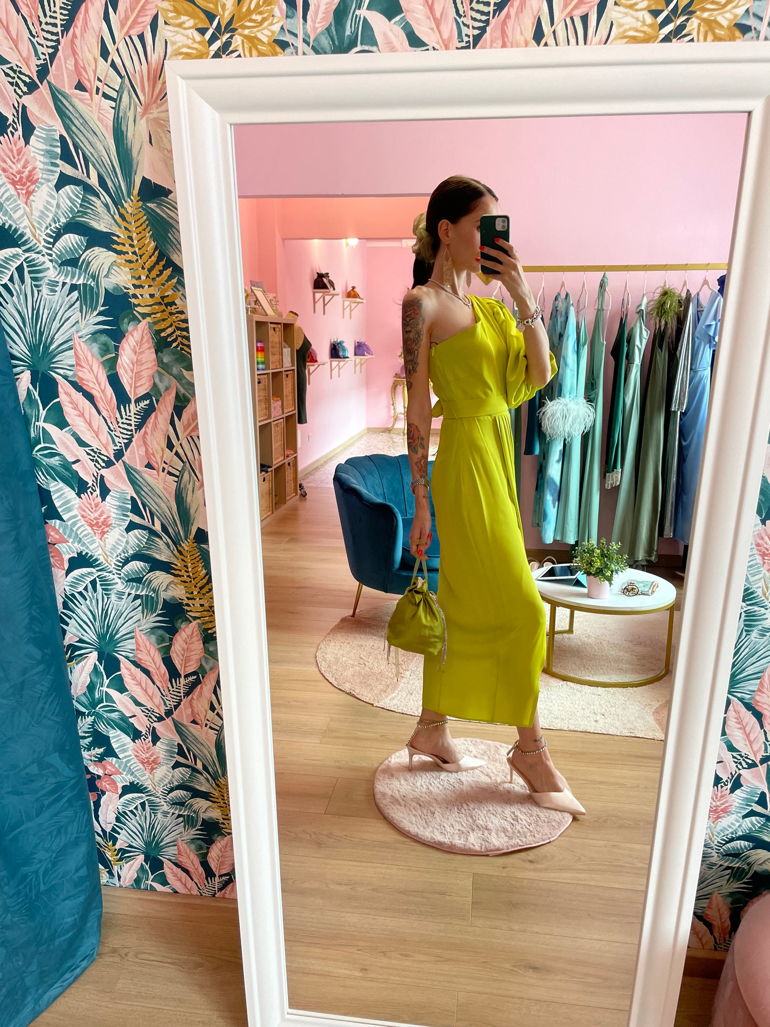 Abito monospalla color lime in crepe. Manica a palloncino. Chiusura con zip, stile portafoglio con spacco frontale. Cinturino in vita.