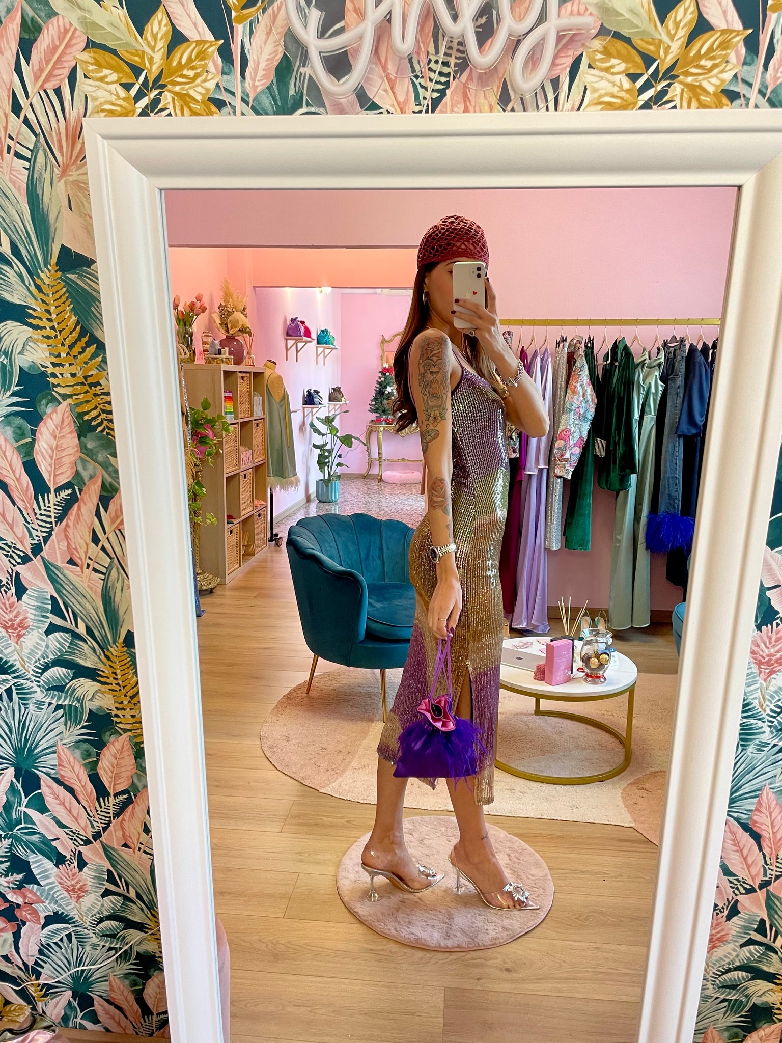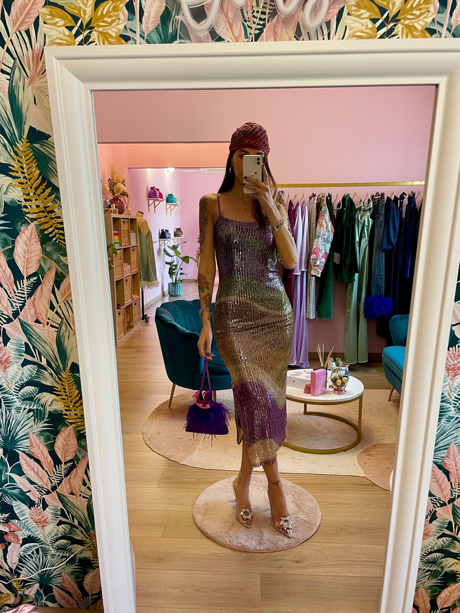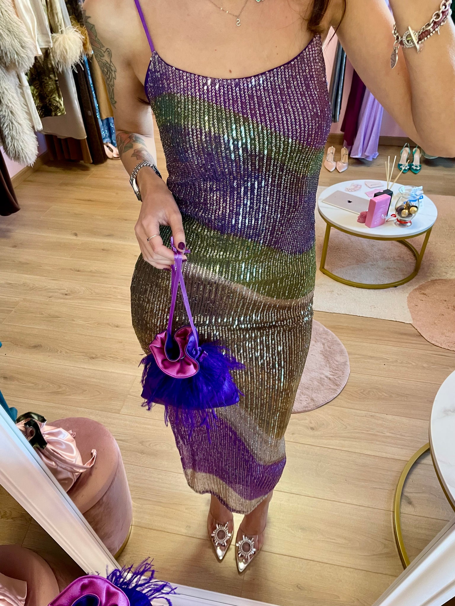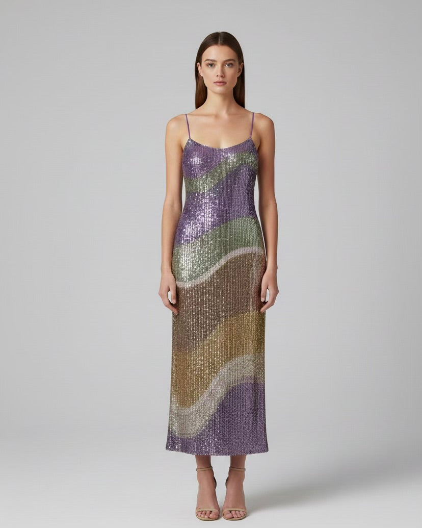 Abito midi multicolor paillettes sfumate. Spallini sottili viola. Elasticizzato.