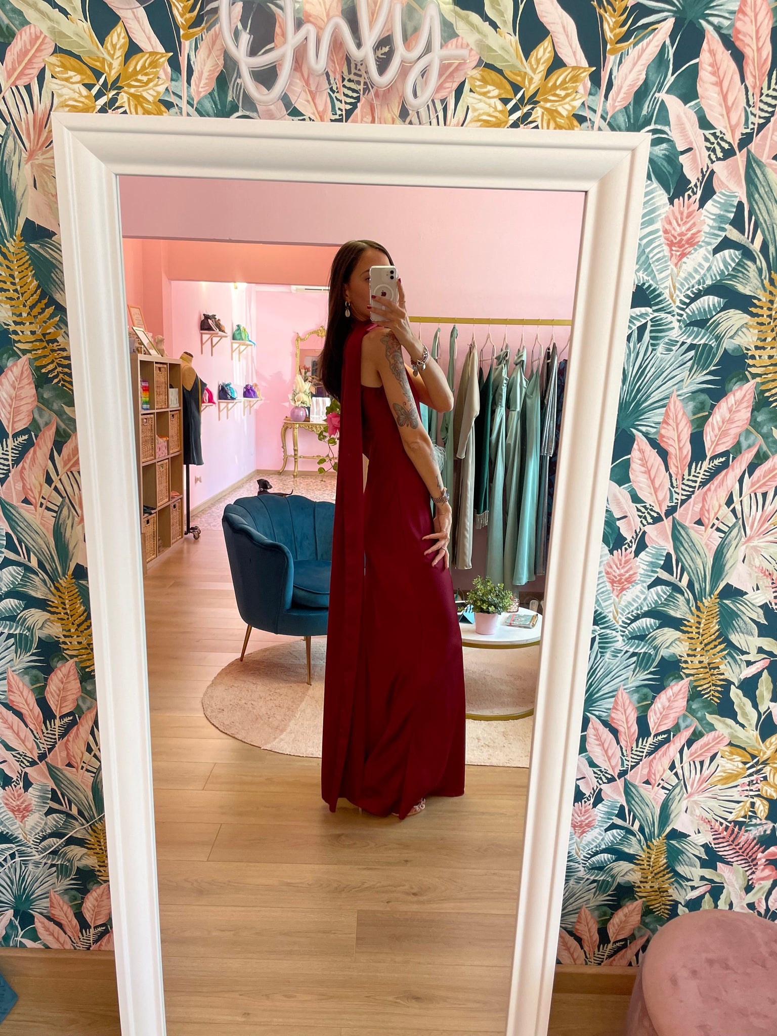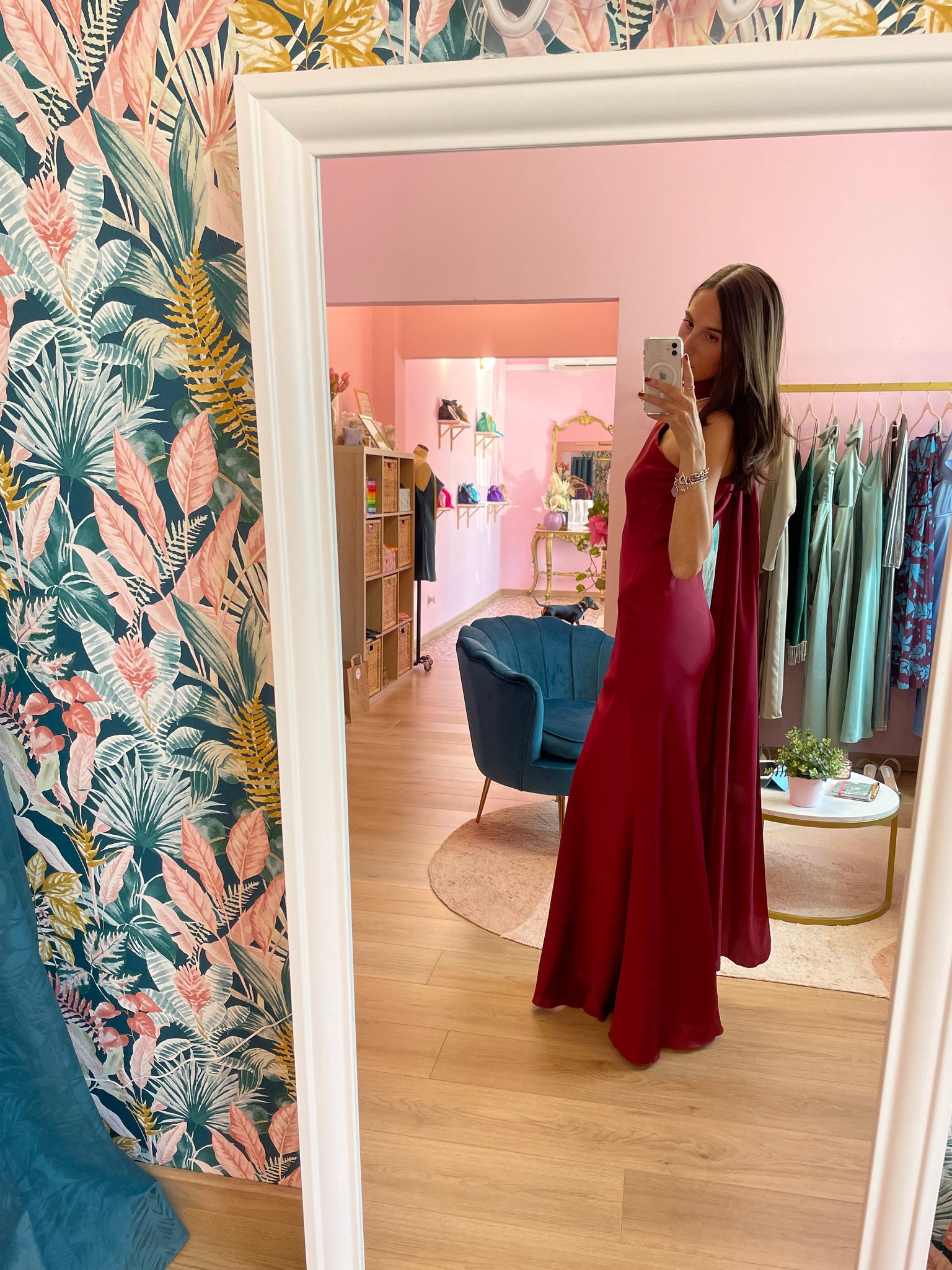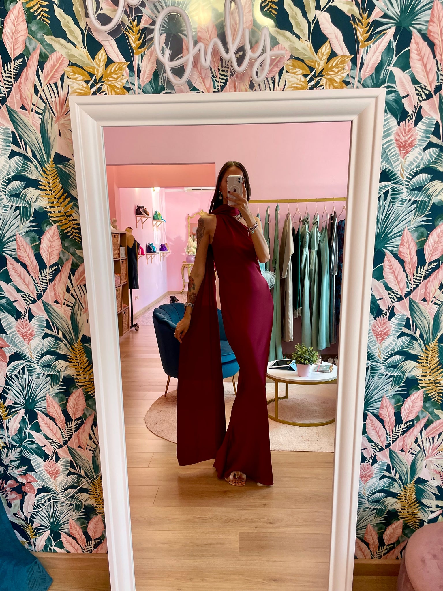 Abito monospalla con drappeggio/scialle in raso borgogna. Versione maxi non aderente ma che segue le linee del corpo.
