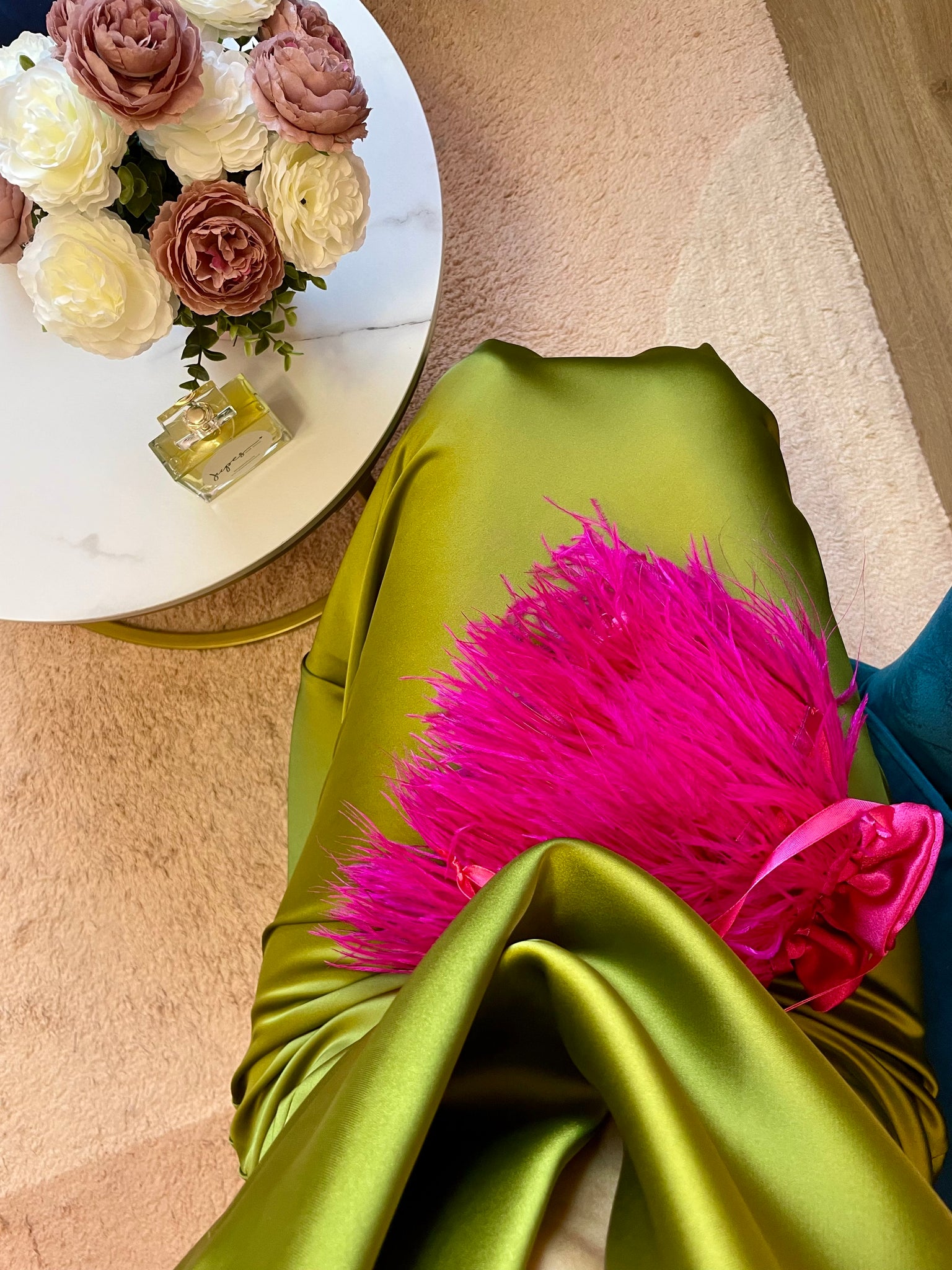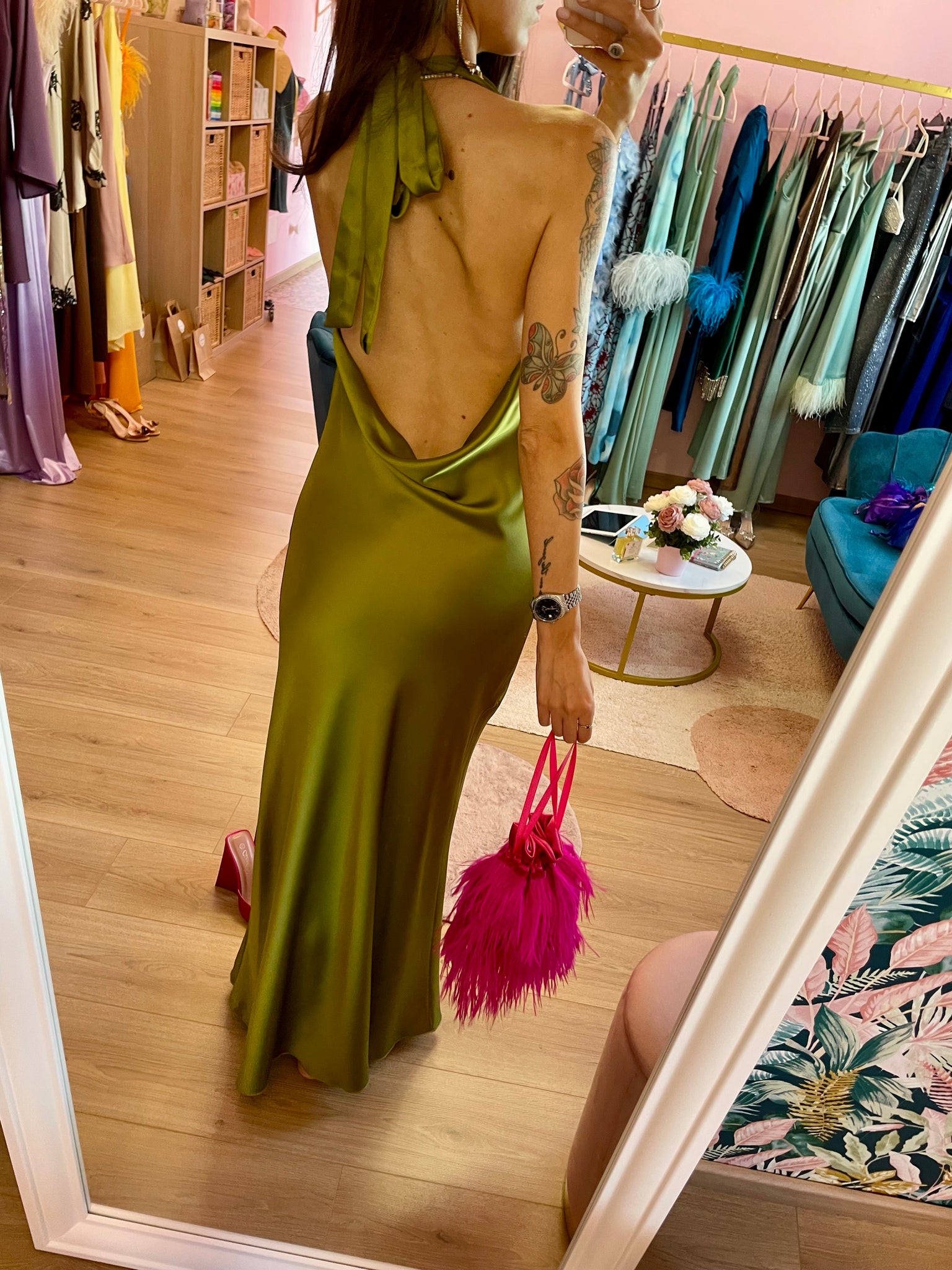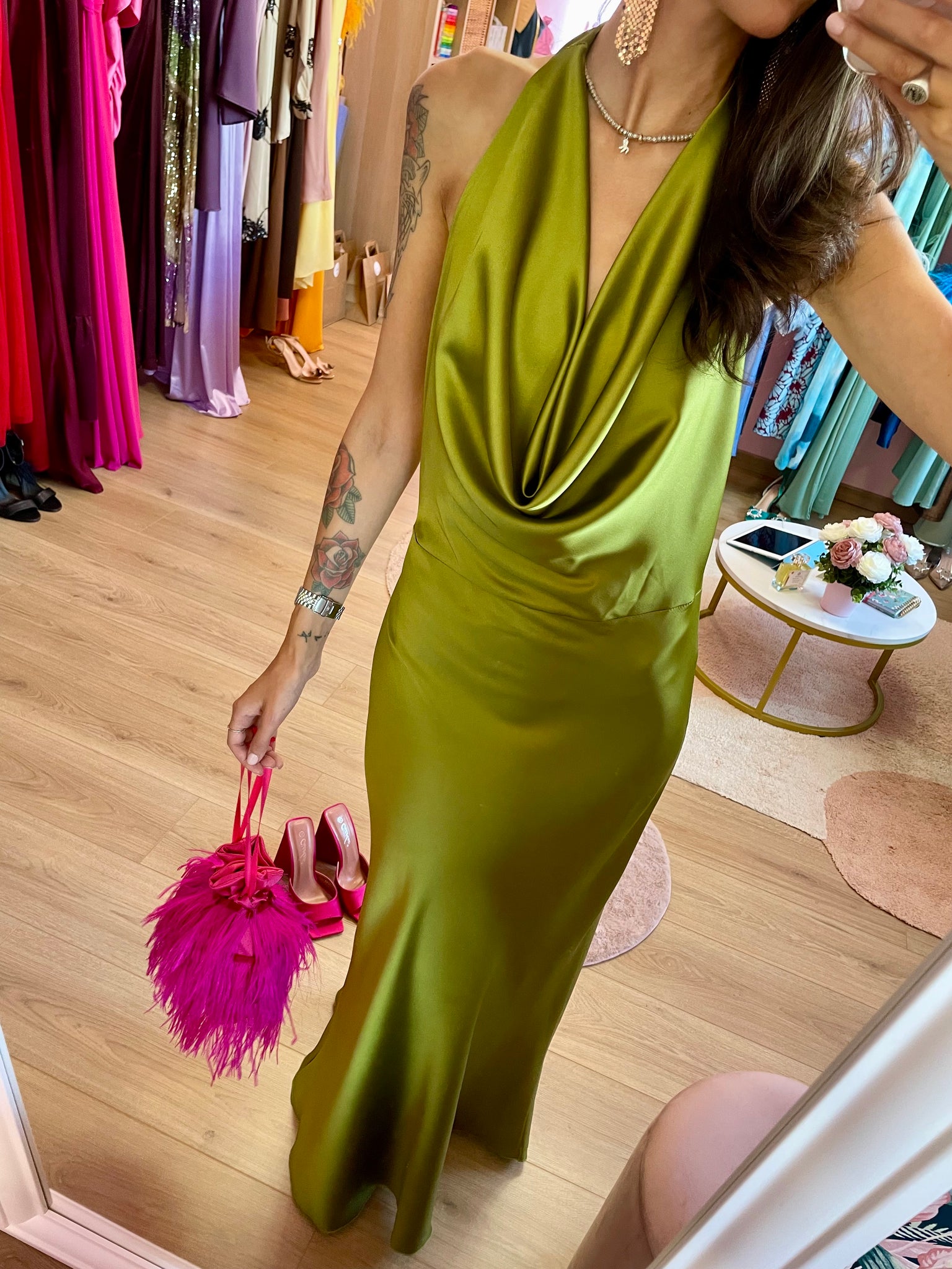 Abito maxi in raso satinato color verde acido. Scollo profondo ad anello sul davanti e sul retro. Chiusura a fiocco sul collo.