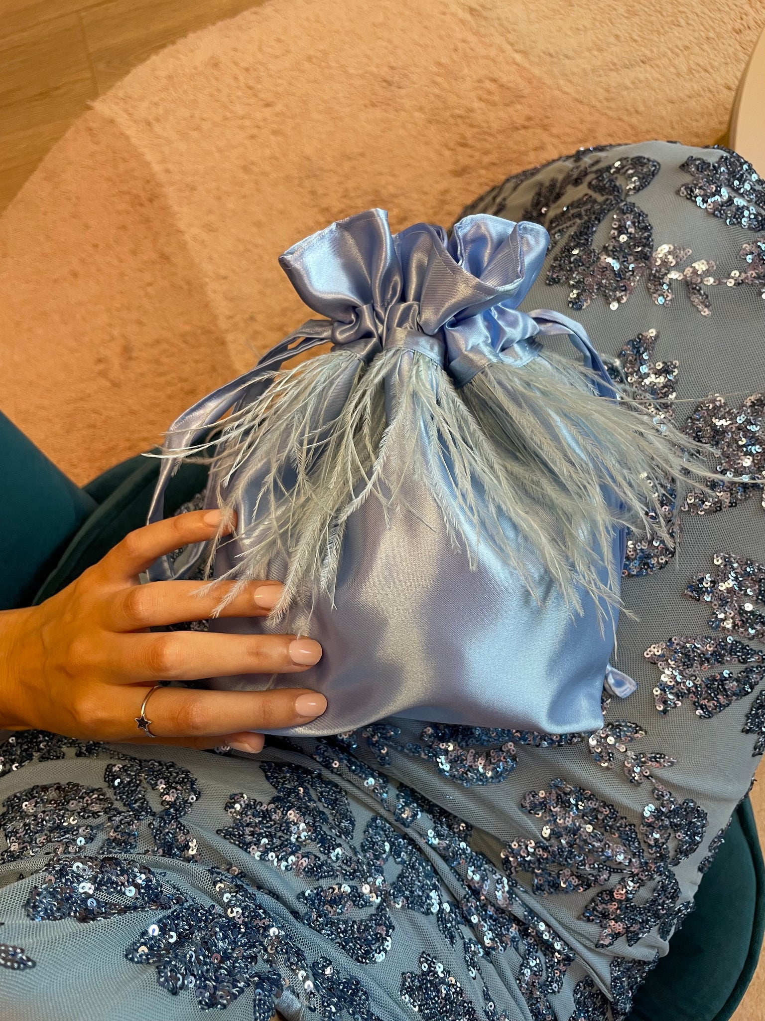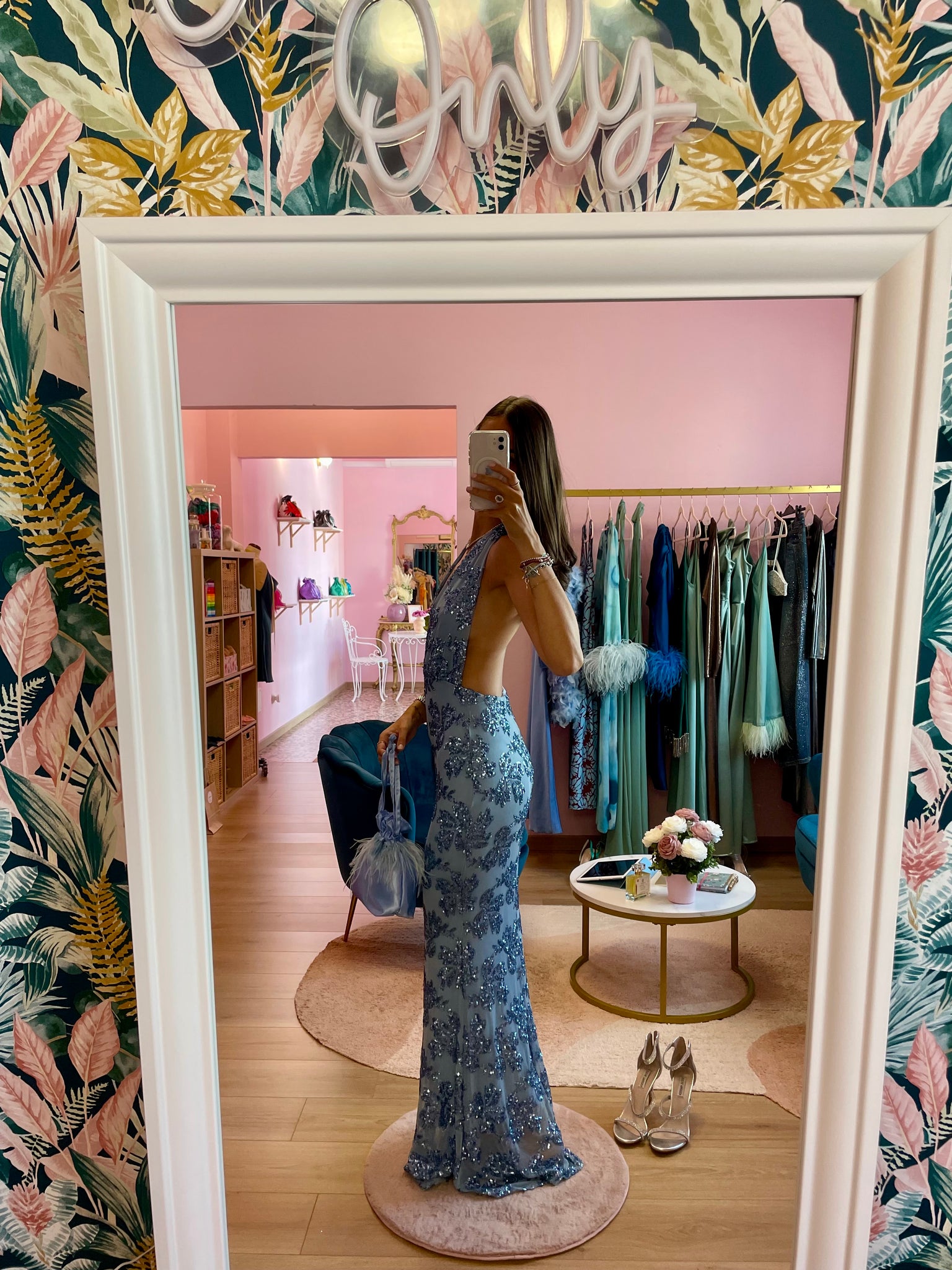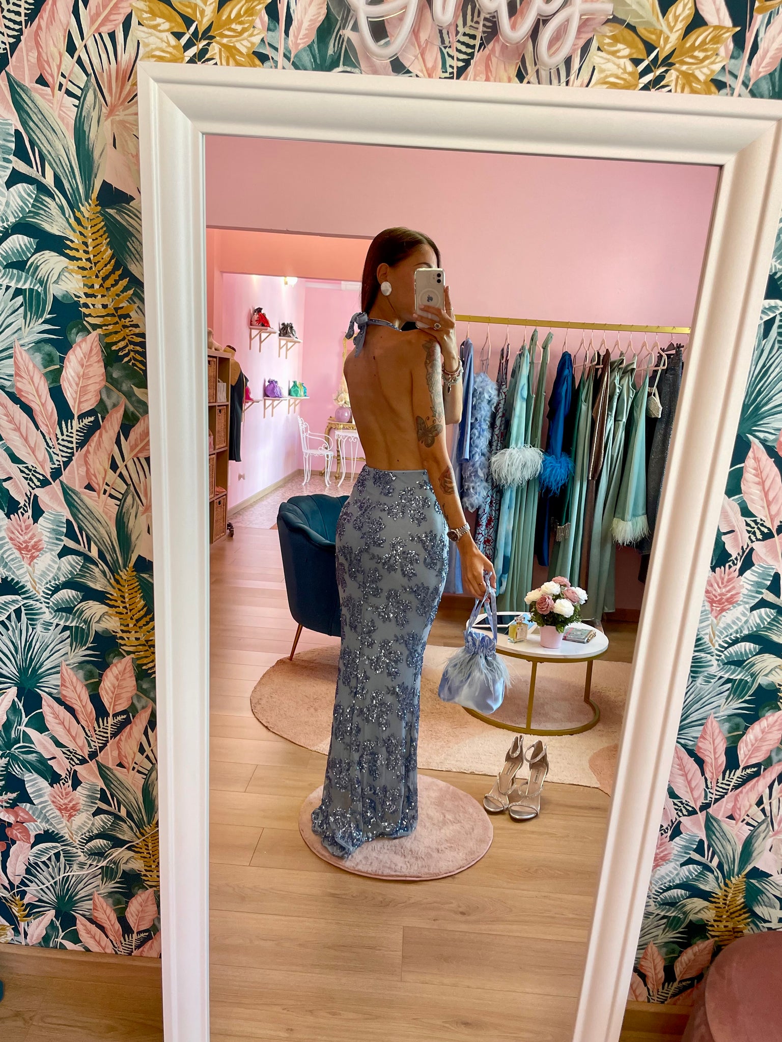Abito maxi, modello sirena color azzurro pastello con micropaillettes. Elasticizzato. Scollo profondo sul davanti con chiusura al collo con lacci. Schiena nuda.