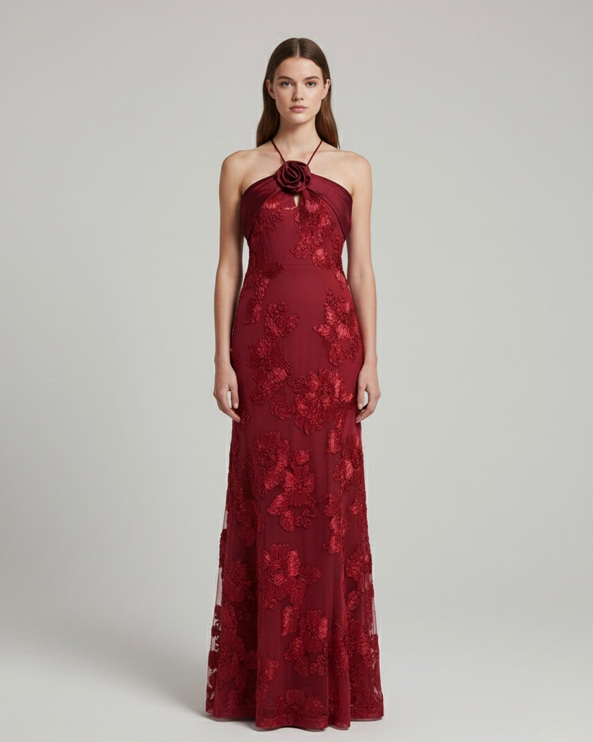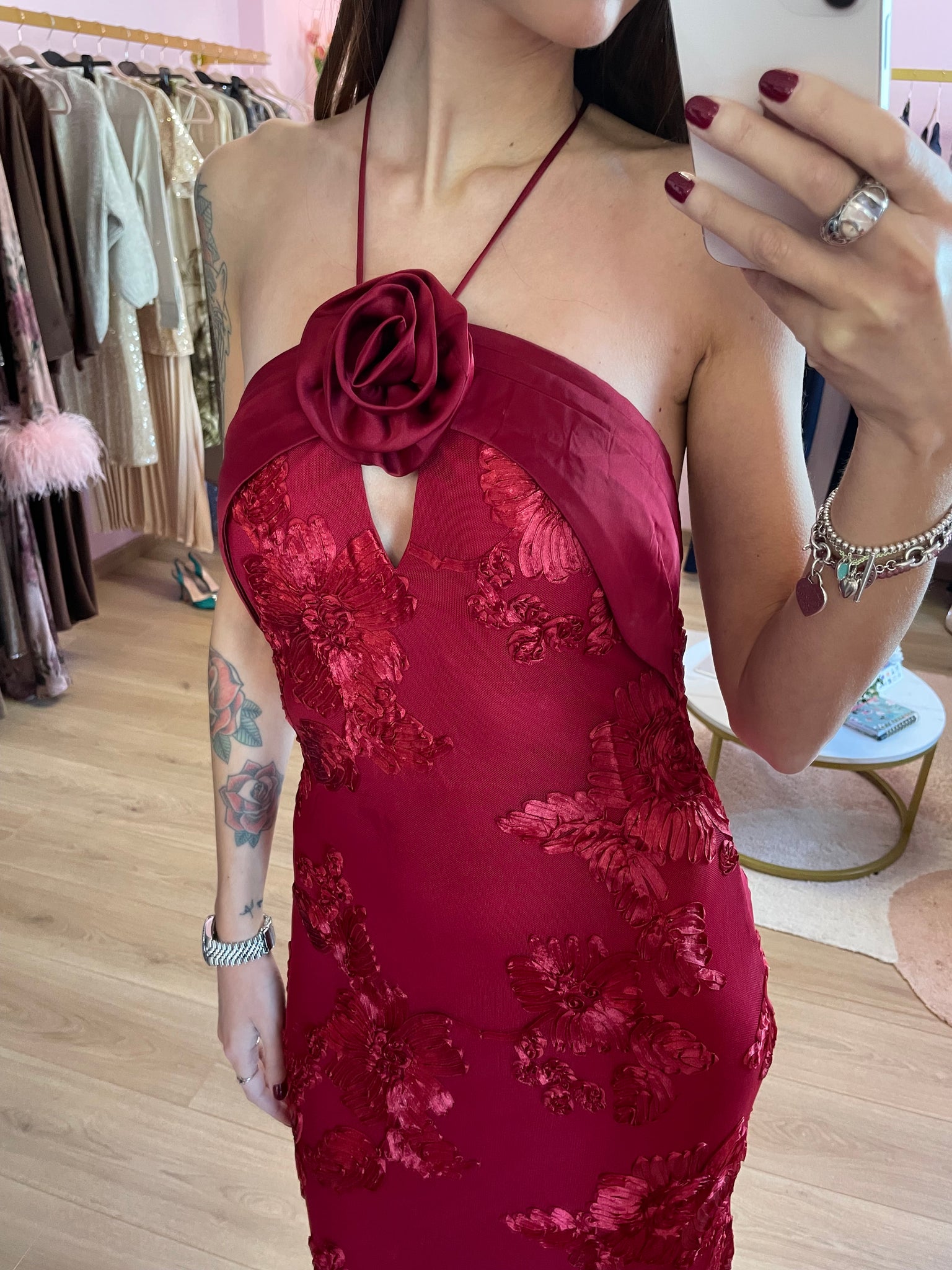 Abito maxi color bordeaux con dettagli in rilievo floreali e con rosa centrale da cui parte l'allacciatura intrecciata sul retro. Dettaglio foglie sul finale dei lacci.