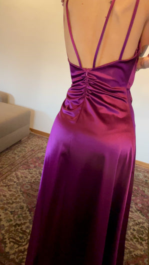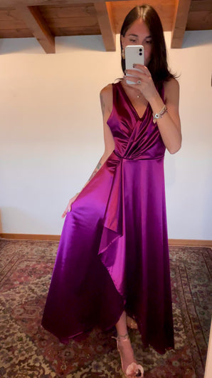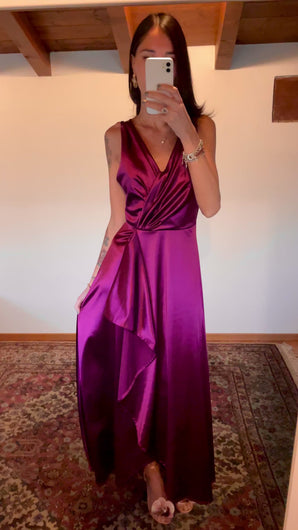 Abito maxi con scollo a tulipano in raso vinaccia. Drappeggio sul davanti. spallini sottili e zip sul retro con arricciature.