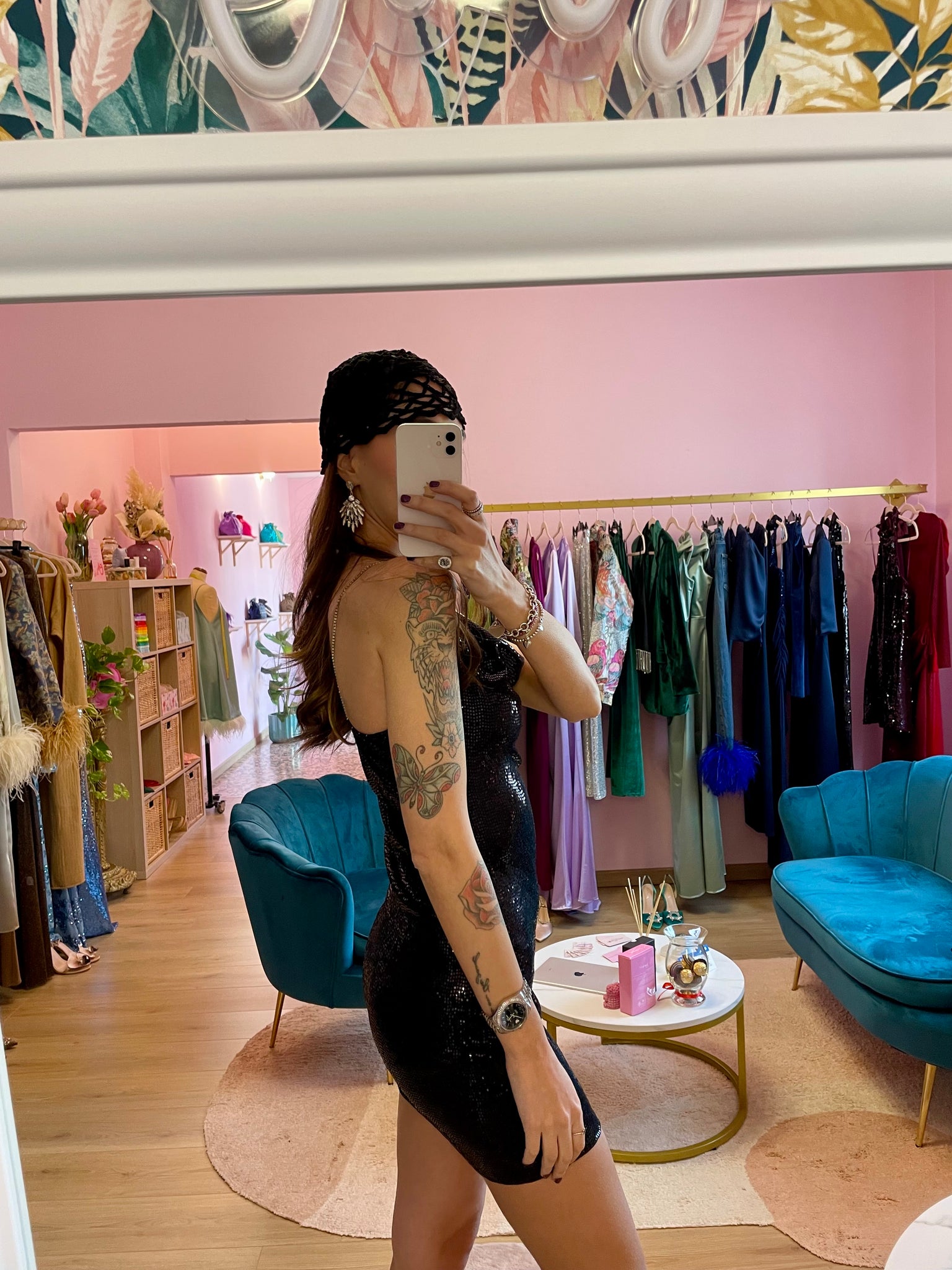 Abito "modello Venus" mini (sartoriale by Jupes and more) con scollo ad anello. Spallini strass cuciti a mano. Micro paillettes.