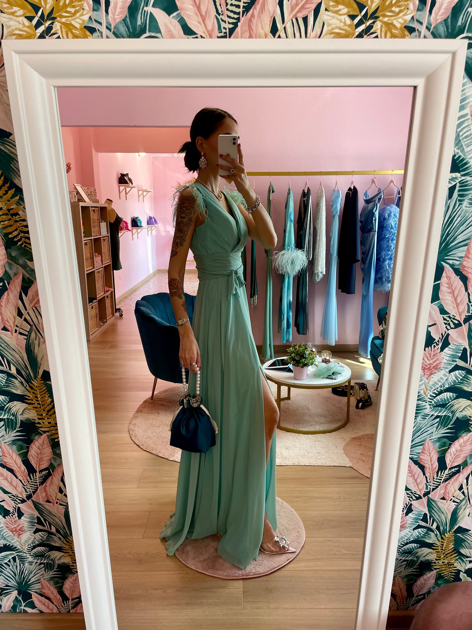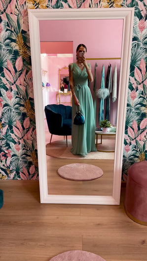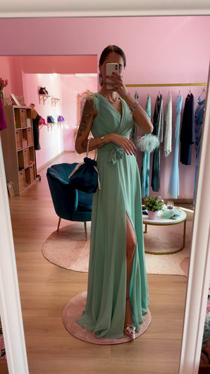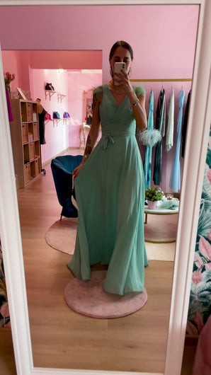 Abito maxi verde acqua con fiocco in vita, scollo a V sia sul davanti che sul retro. Piumette cucite negli spallini. Zip sul retro e imbottitura sul seno. Spacchetto frontale.