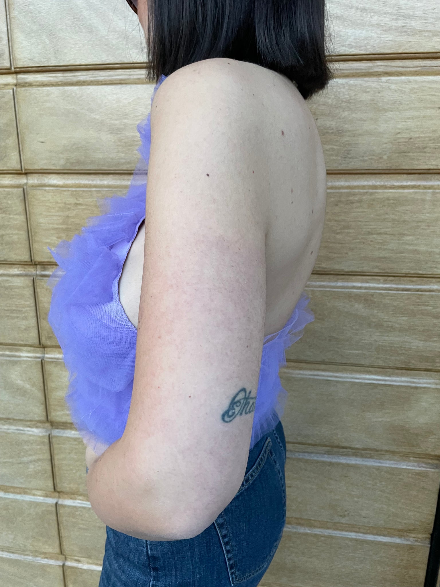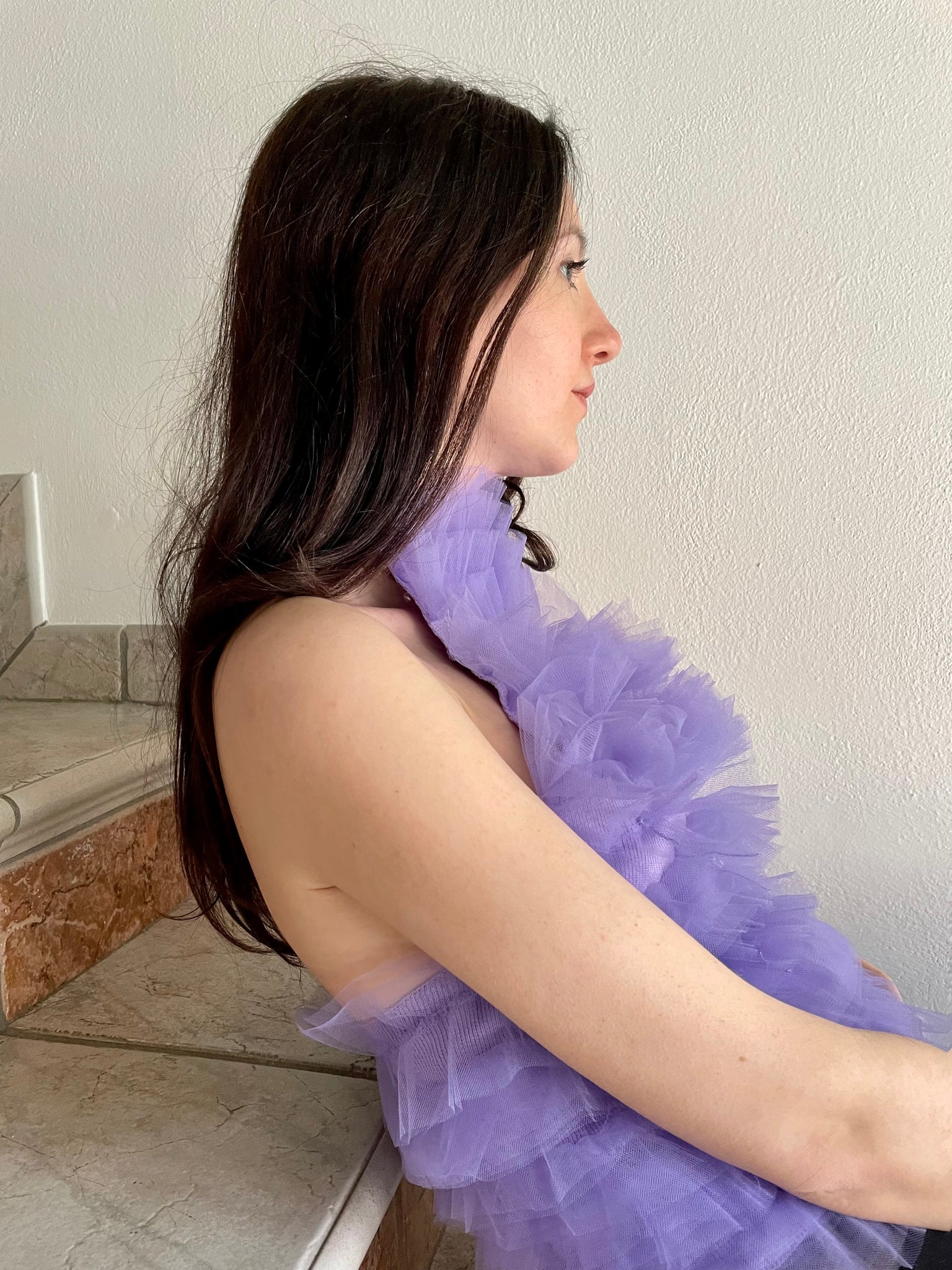 Top in tulle color lilla, con scollo sulla schiena regolabile. Elasticizzato per consentire la vestibilità dalla S alla L.