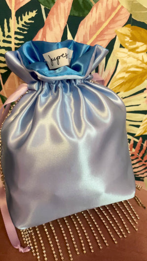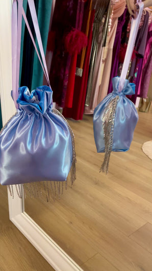 Borsetta media azzurra con frangia strass cucita a mano handmade in raso interno ed esterno. Manici in raso. Perfetta per completare il tuo outfit da cerimonia.