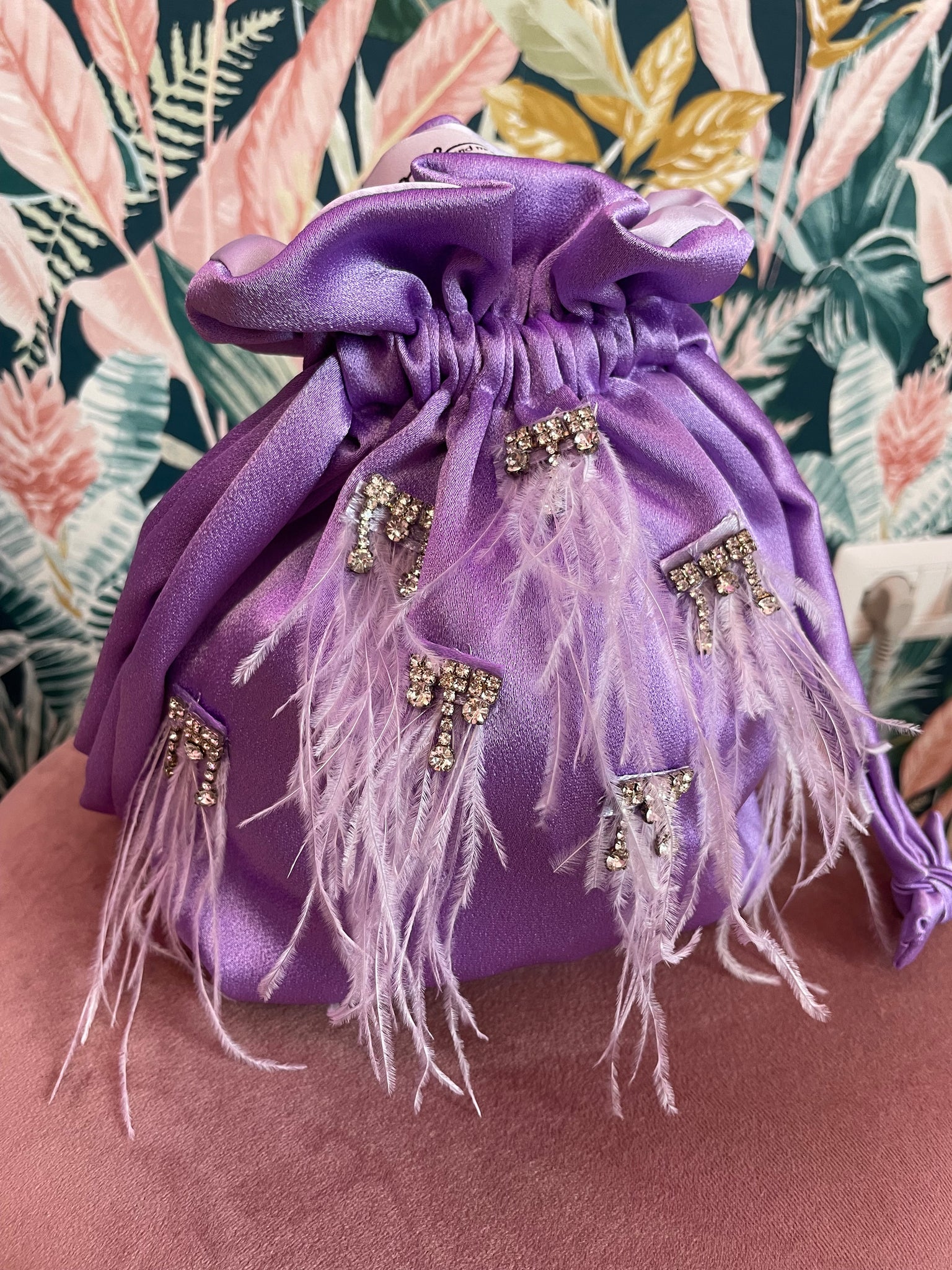 Borsetta media lilla handmade in raso con ciuffi di piume cucite a mano lilla con gocce di cristalli e raso rosa interno; manici in raso lilla. Perfetta per completare il tuo outfit da cerimonia.