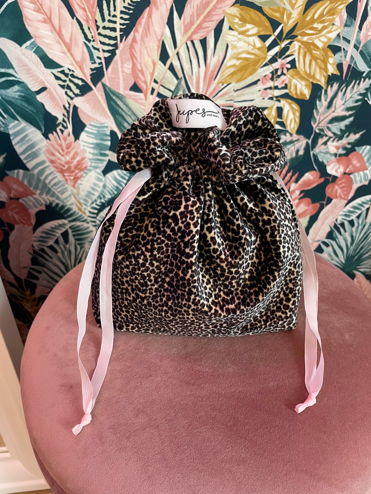 Borsetta midi animalier handmade in ciniglia esterno e interno; manici in nastro organza rosa. Perfetta per completare il tuo outfit da giorno ma anche da sera!