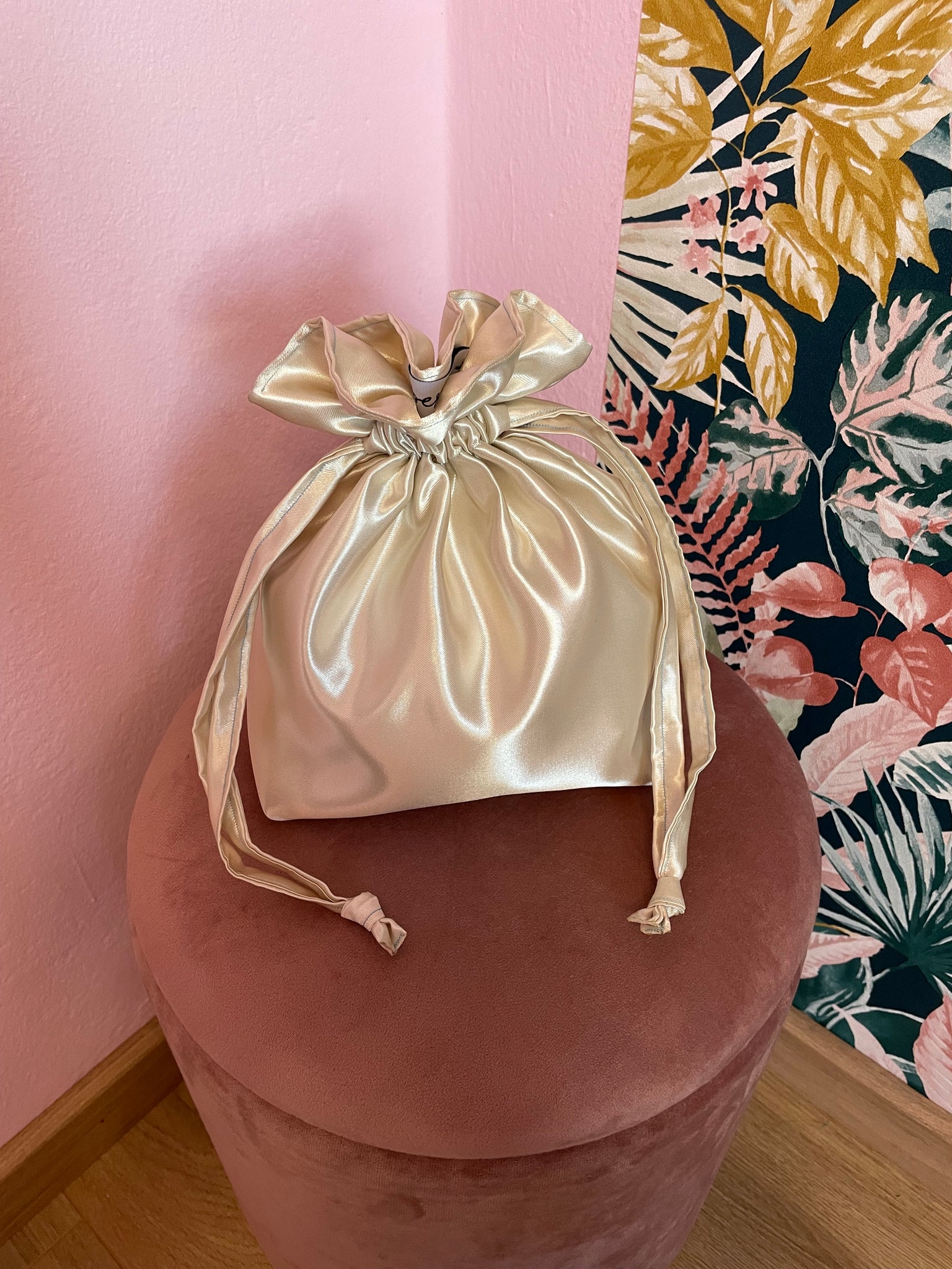 Borsetta media in raso esterno e interno champagne chiaro e manici in raso champagne. Perfetta per completare il tuo outfit da cerimonia.