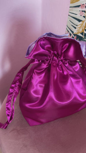 Borsetta media in raso malva esterno e lilla interno. Manici in raso malva. Perfetta per completare il tuo outfit da cerimonia.