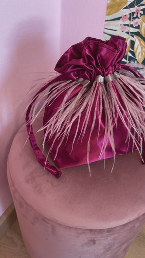 Borsetta media in raso esterno e interno prugna handmade; giro di piume di struzzo cucite a mano rosa antico e manici in raso prugna. Perfetta per completare il tuo outfit da cerimonia.