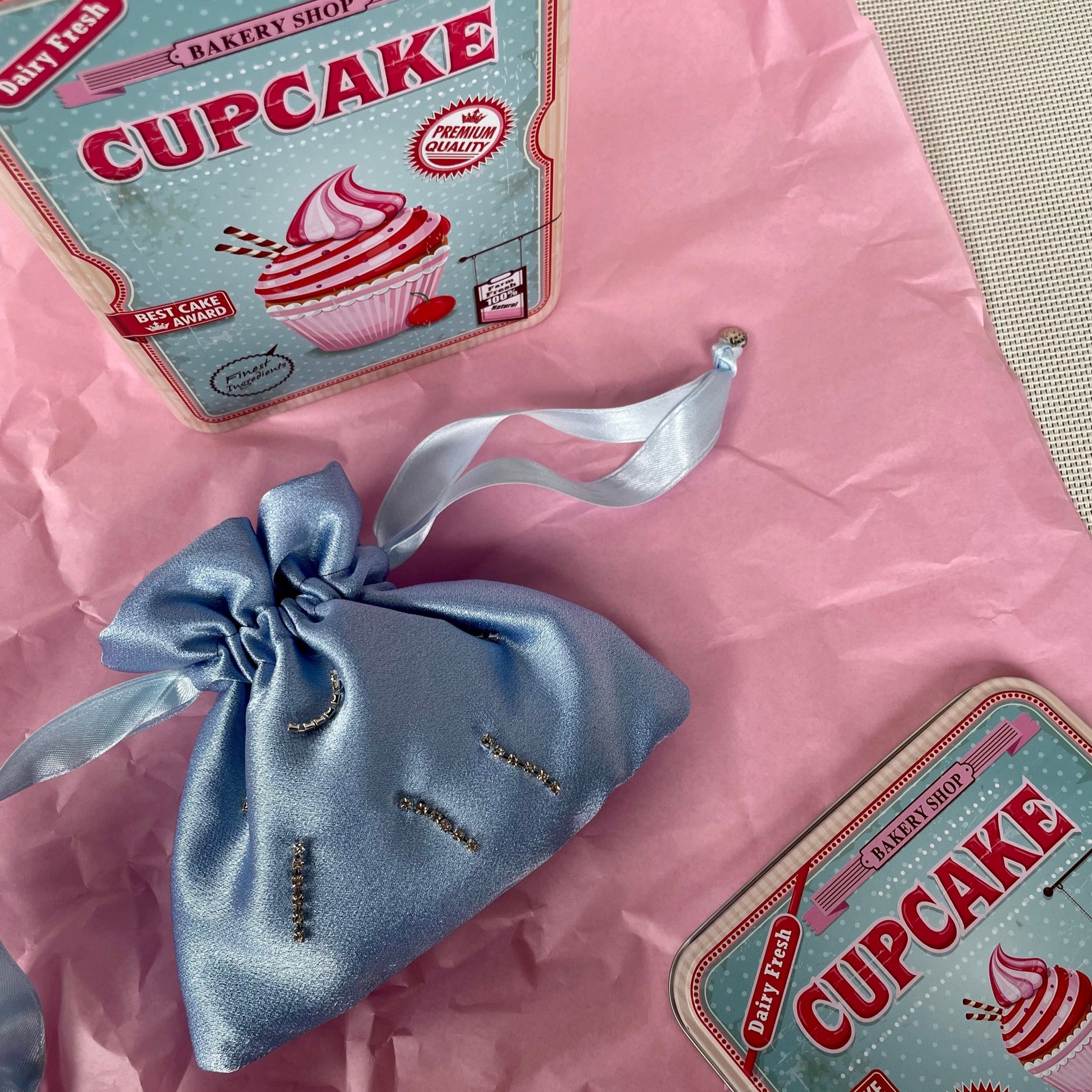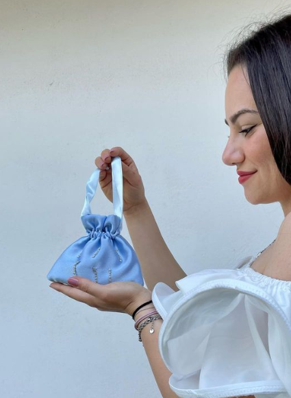 Borsetta micro azzurra handmade in raso esterno con mini punti luce strass cuciti a mano e raso interno malva; nastrini in raso azzurri con chiusure a forma di conchiglia argento. Perfetta per completare il tuo outfit da cerimonia.