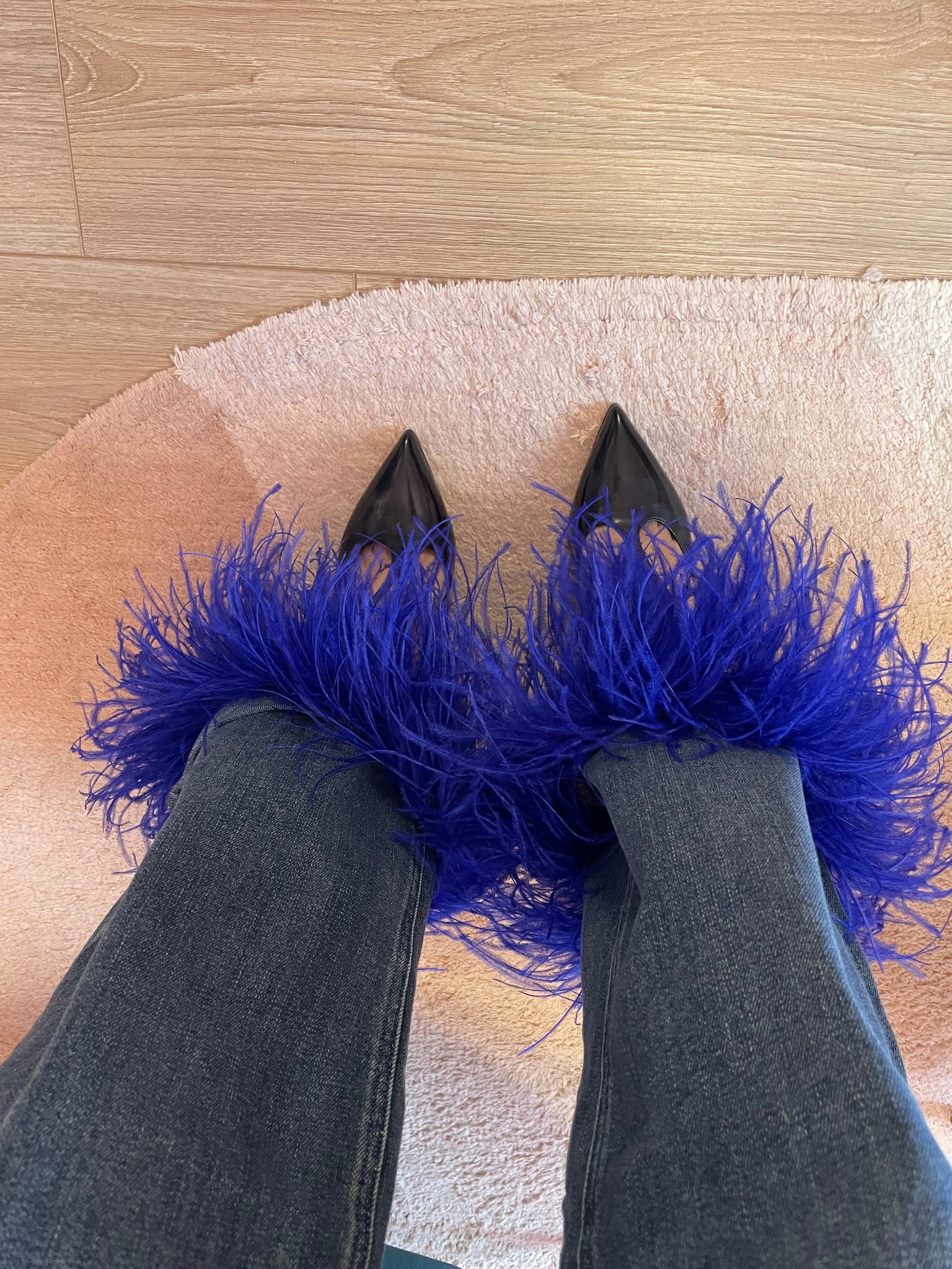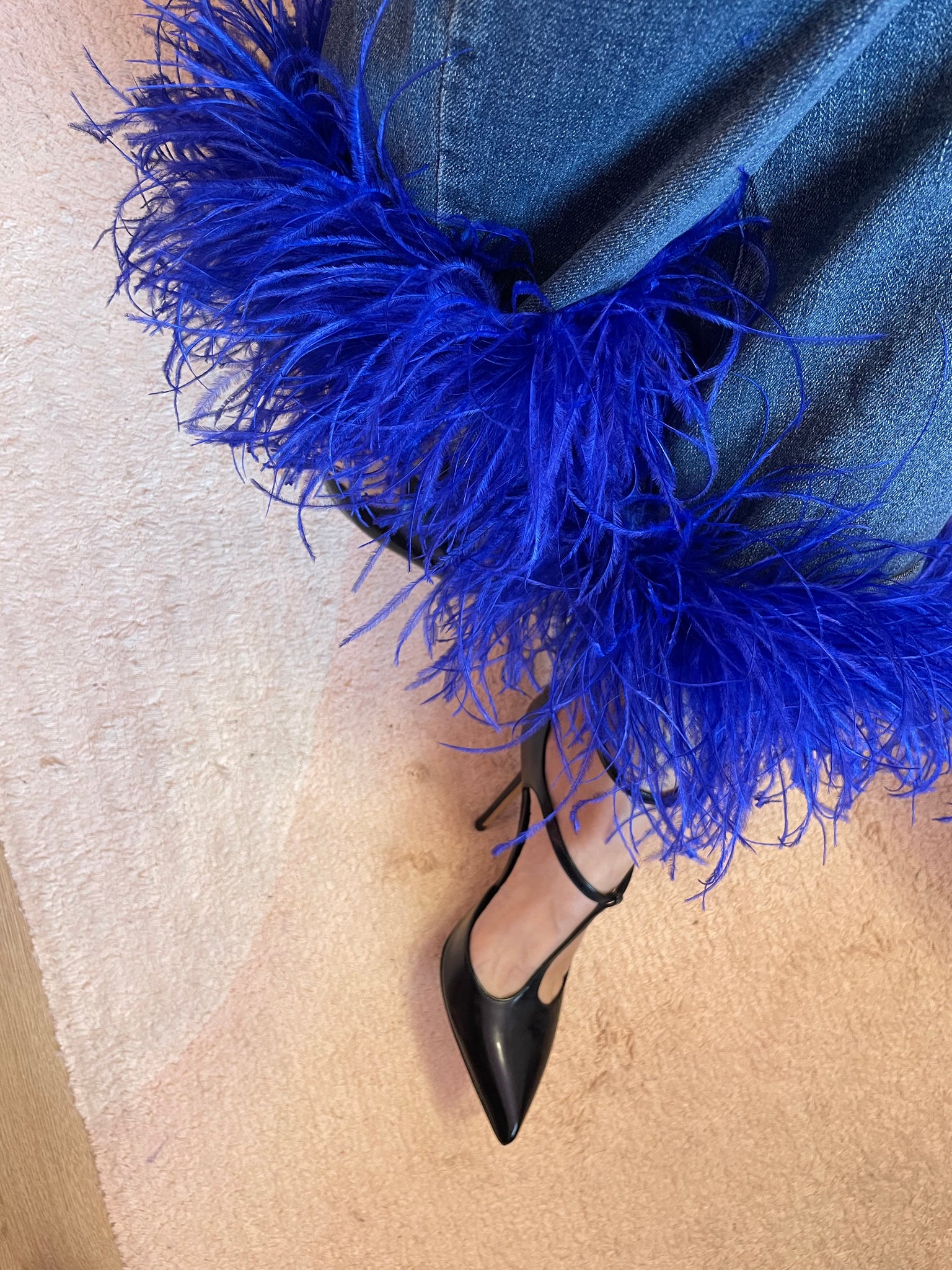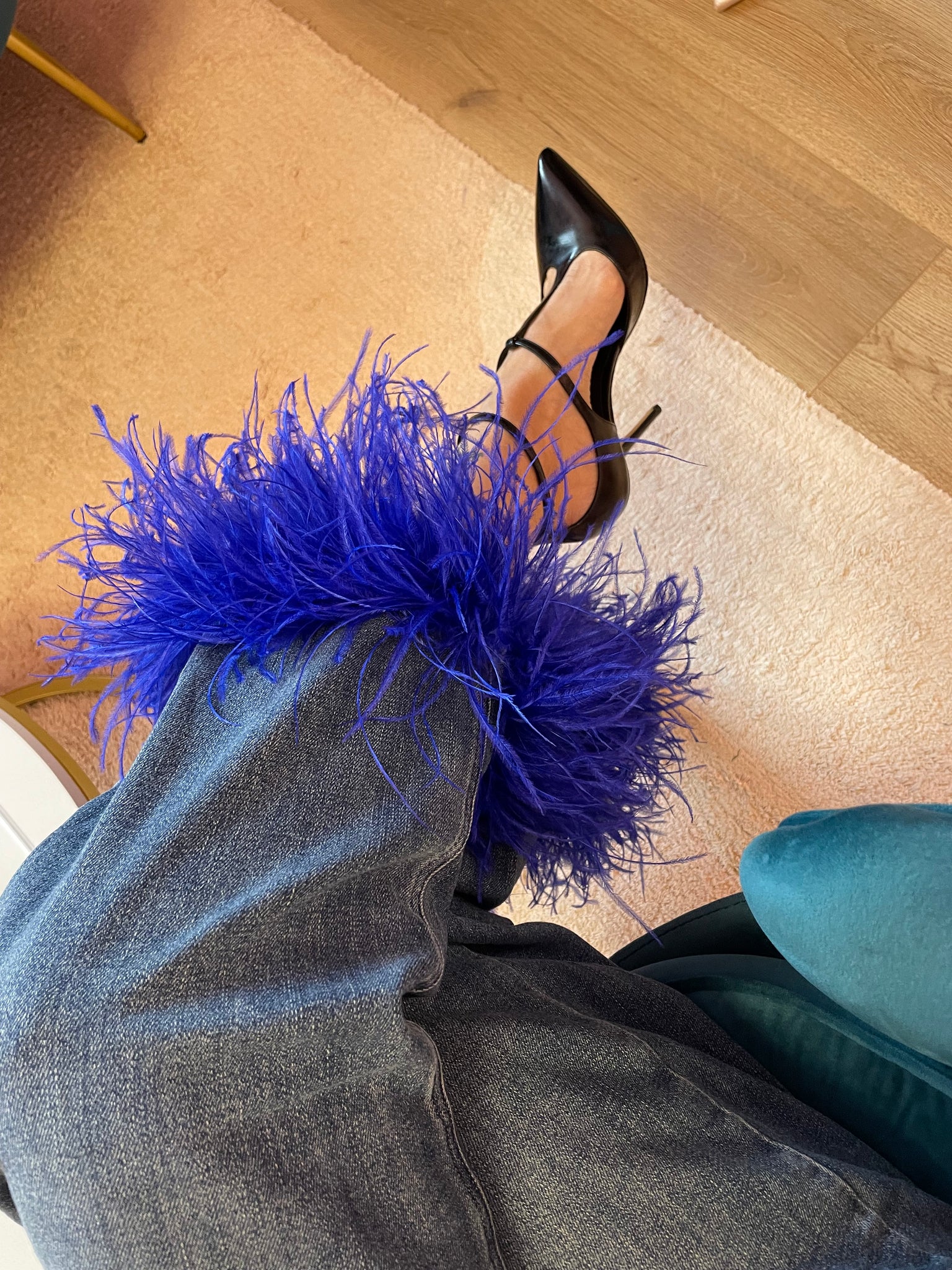 Jeans in cotone elastico a medio lavaggio "wide-leg". Boa in piume di struzzo (volume 6 strati) color blu elettrico cucito a mano tramite asoline elastiche e bottonicini. Piume removibili per il lavaggio.