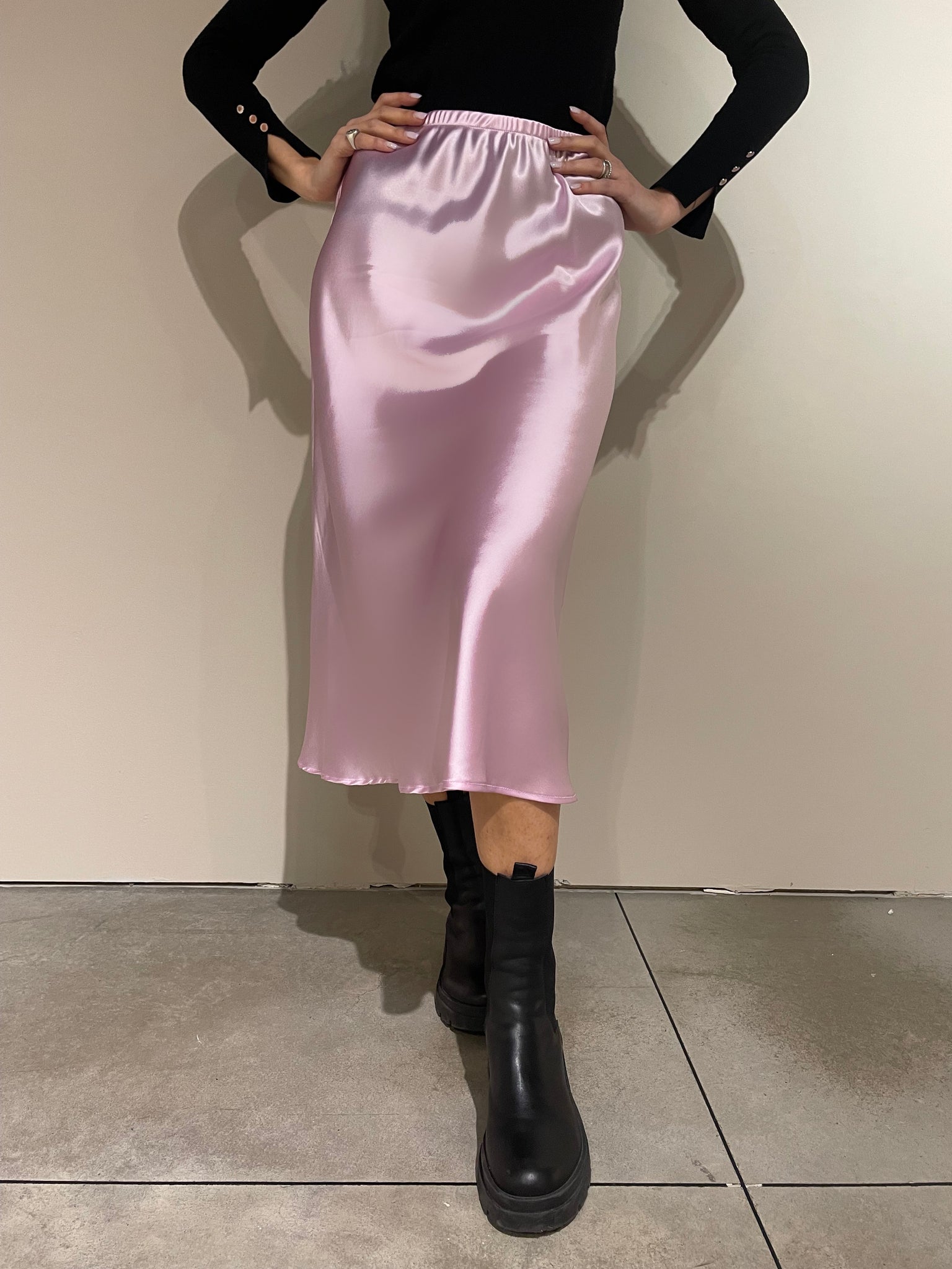 Gonna midi in rasetto satinato color lilla, con elastico in vita. Realizzata a mano.