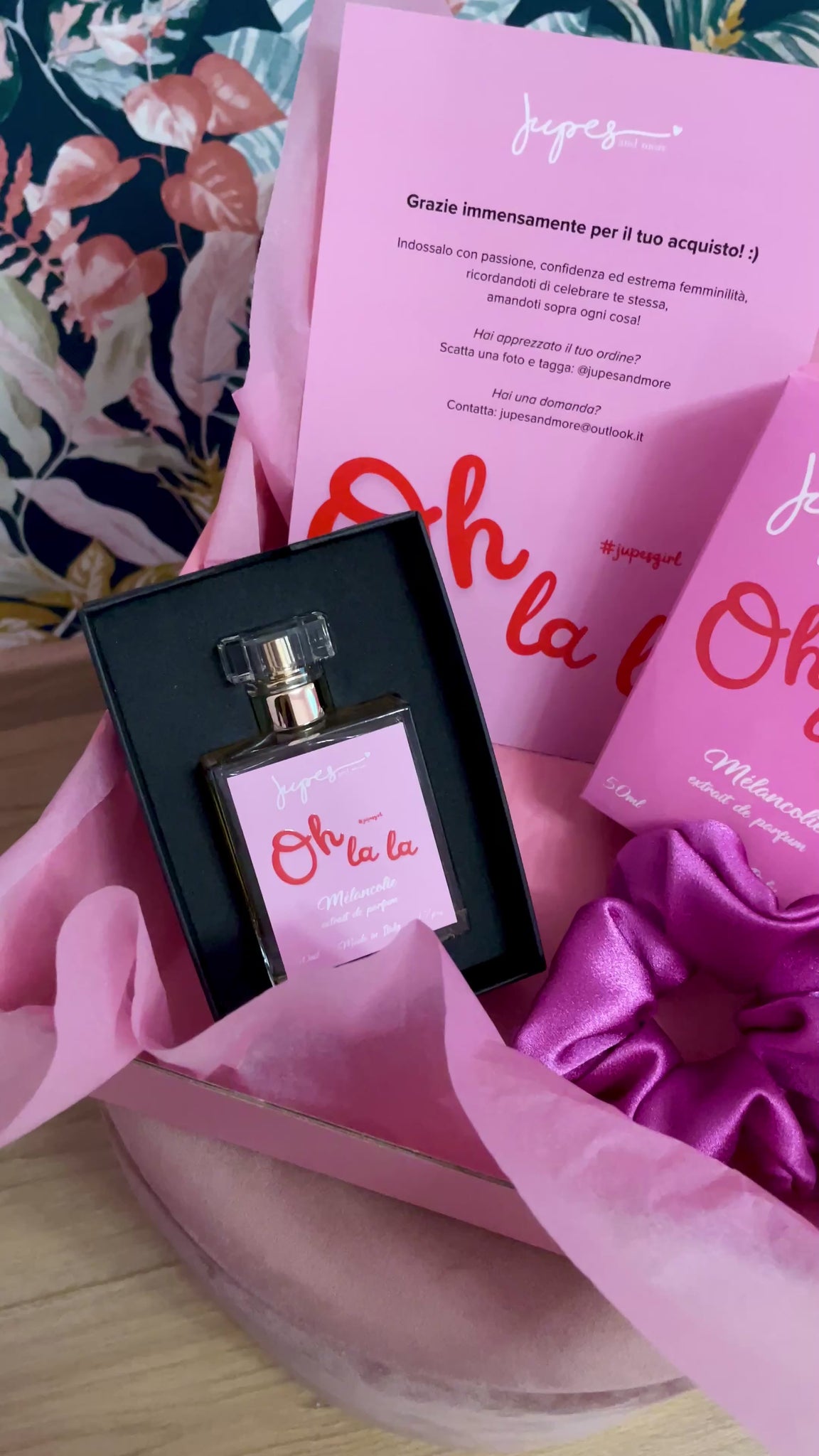Pink Box in cartone color rosa pastello composta da: 1 Scrunchy in raso satin fatto a mano e 1 Profumo "Mélancolie". La Pink Box perfetta per un'idea regalo semplice ma non banale!