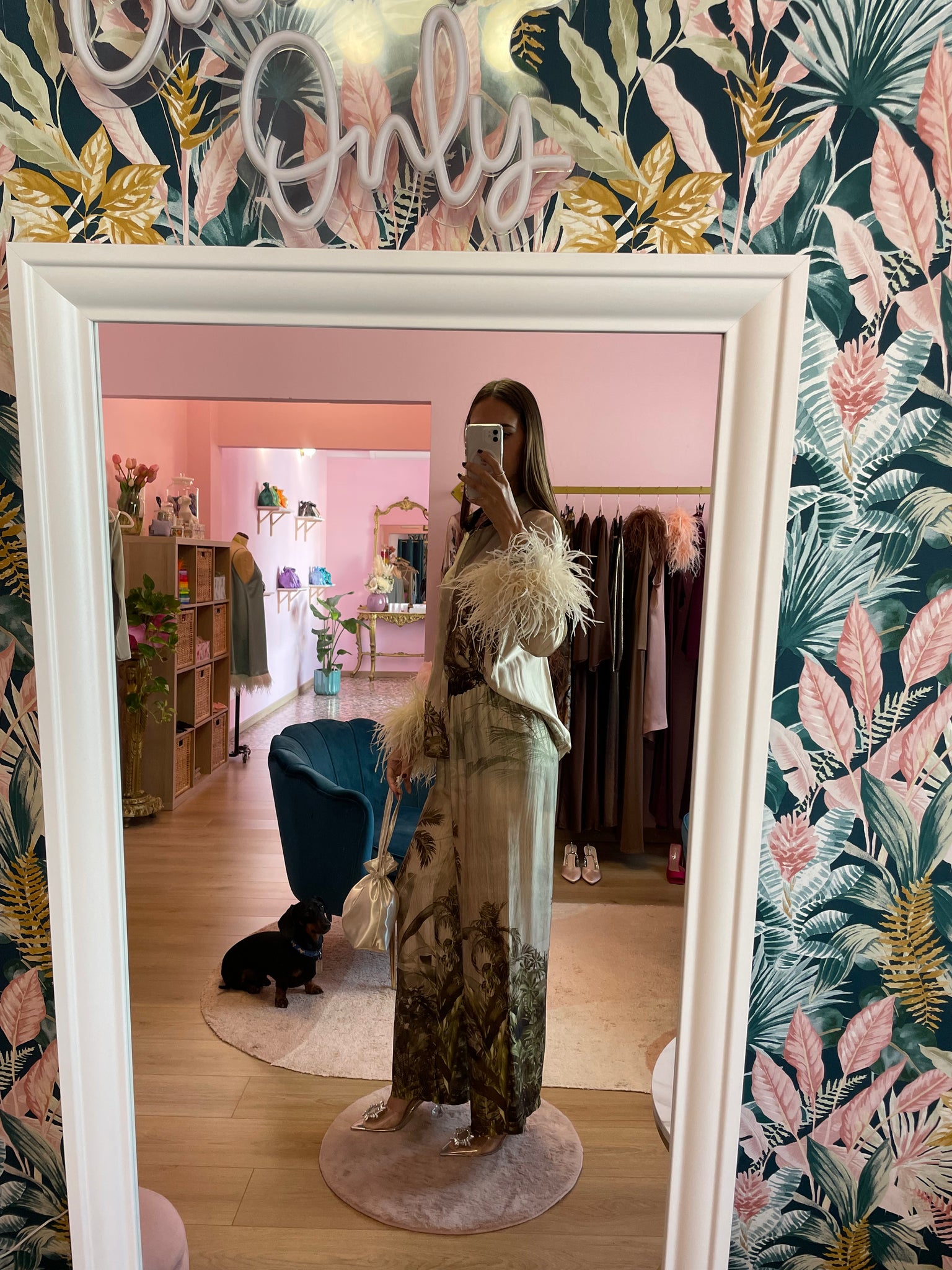 Set in morbida viscosa color champagne composto da camicia over e pantalone elasticizzato. Elegante fantasia con palme e dettaglio boa in piume di struzzo cucite a mano con possibilità di rimozione tramite asoline e bottoncini. Consigliata la rimozione per il lavaggio.