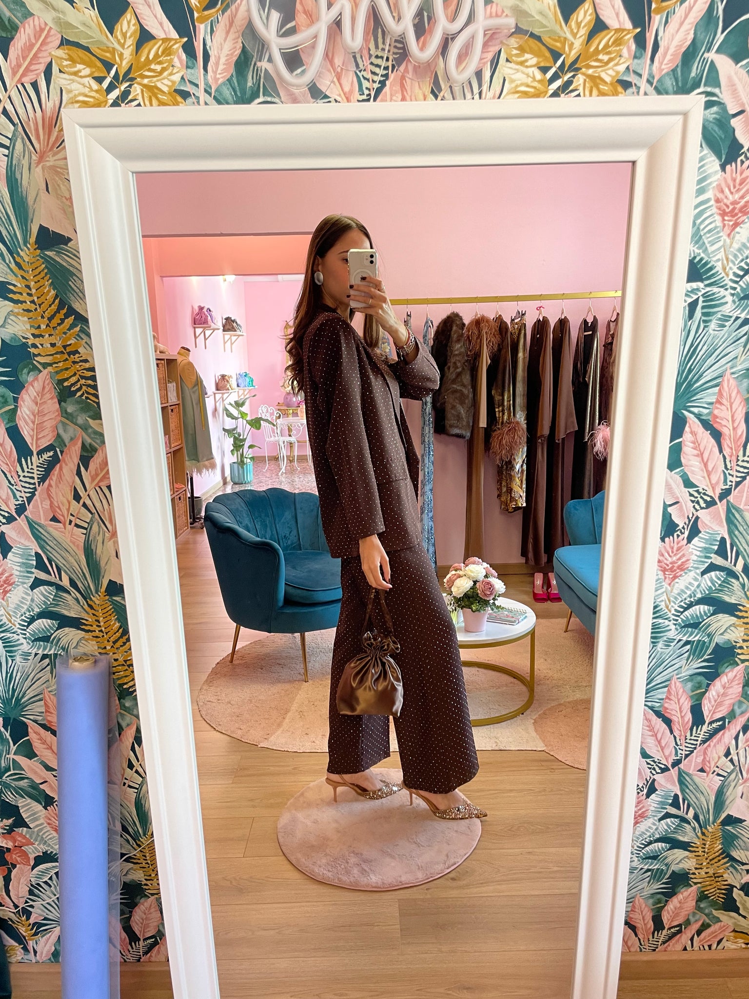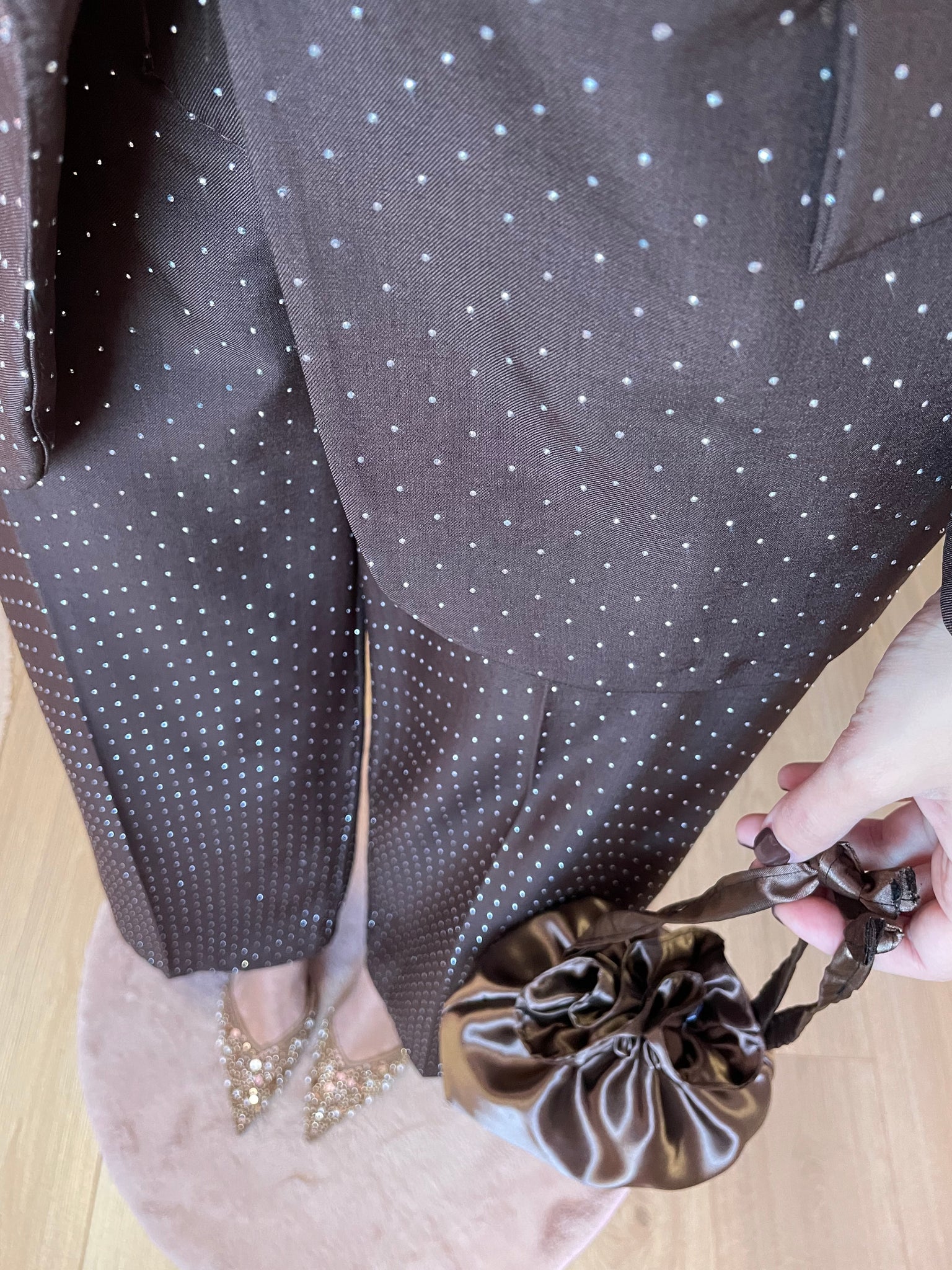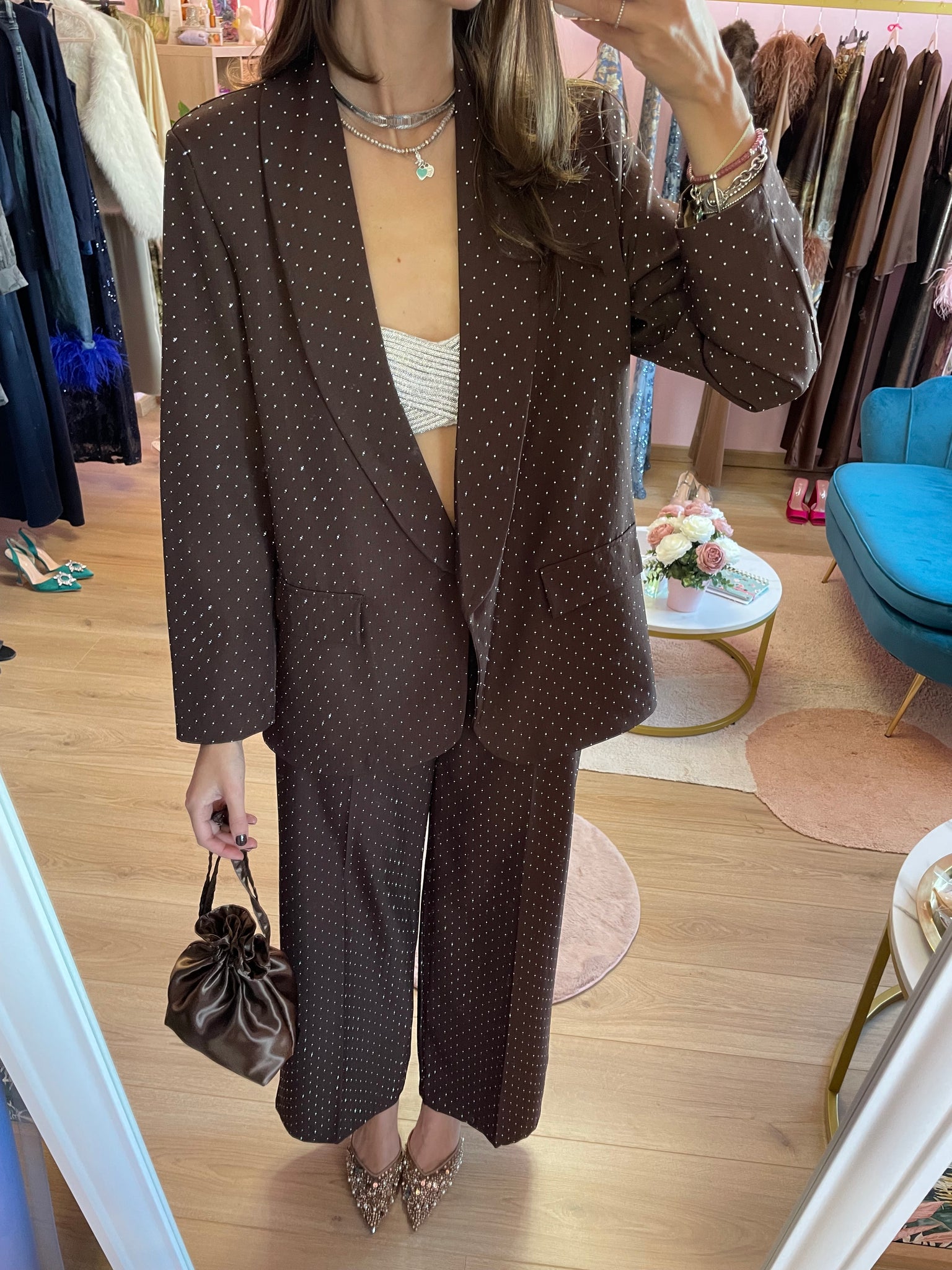 Tailleur composto da pantaloni gamba dritta elasticizzato in vita e giacca taglio maschile aperta con tasche. Tessuto in viscosa con pioggia di strass argento.