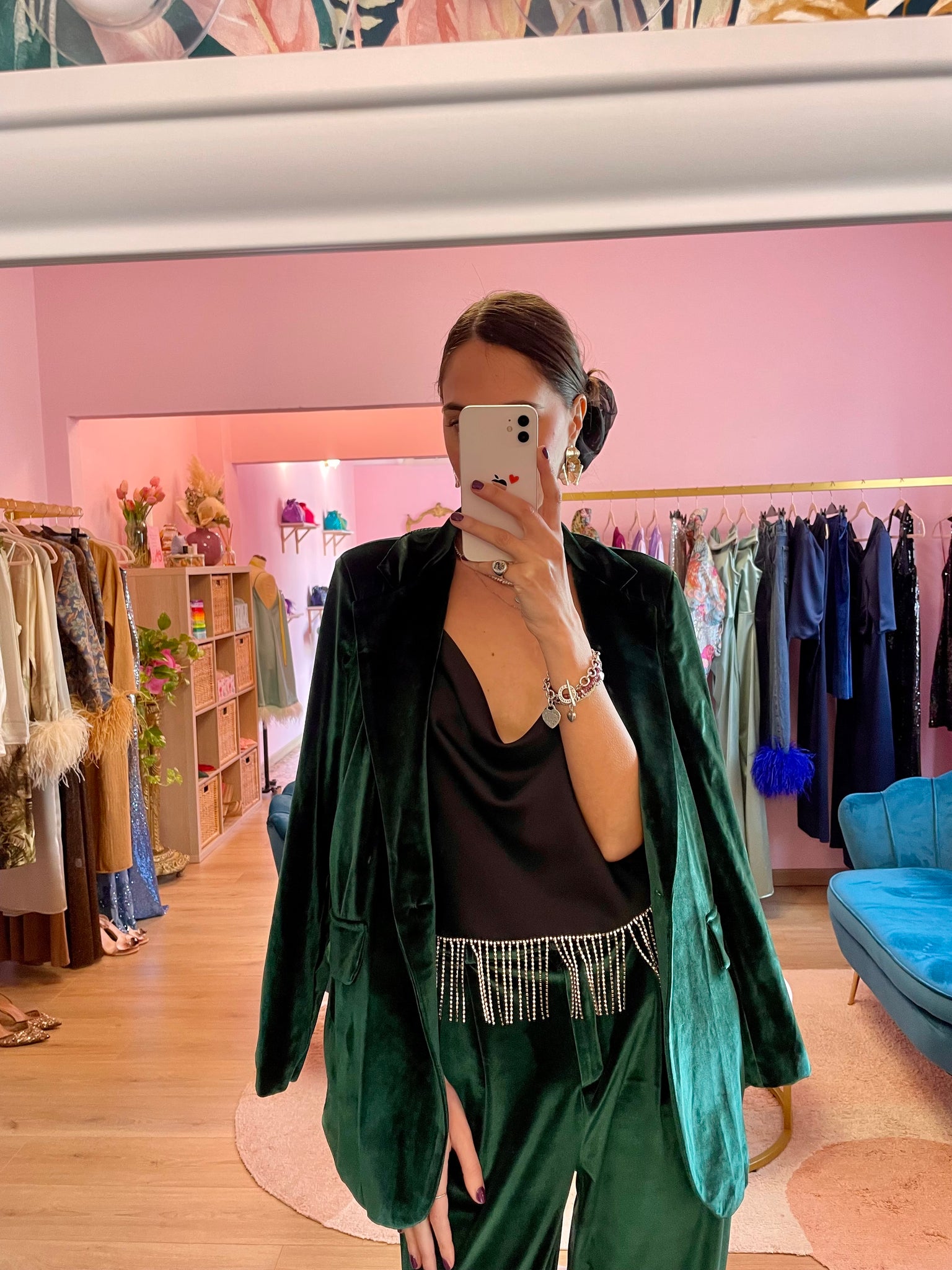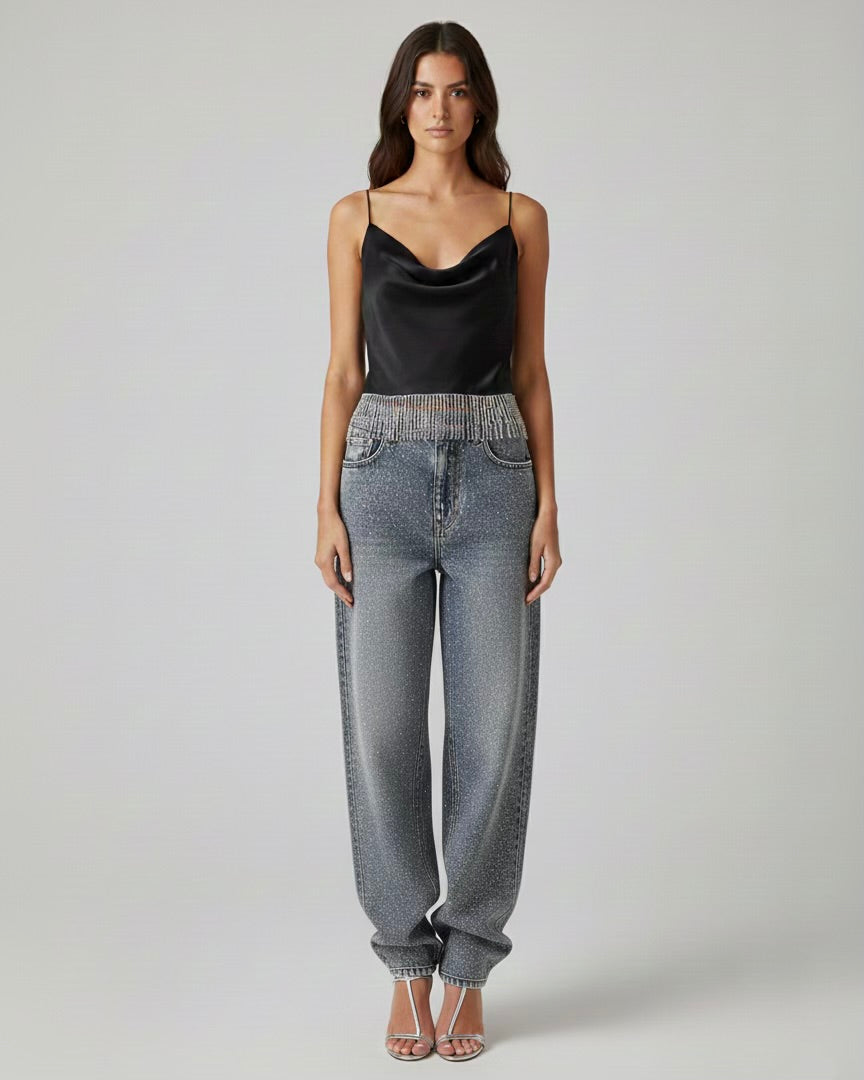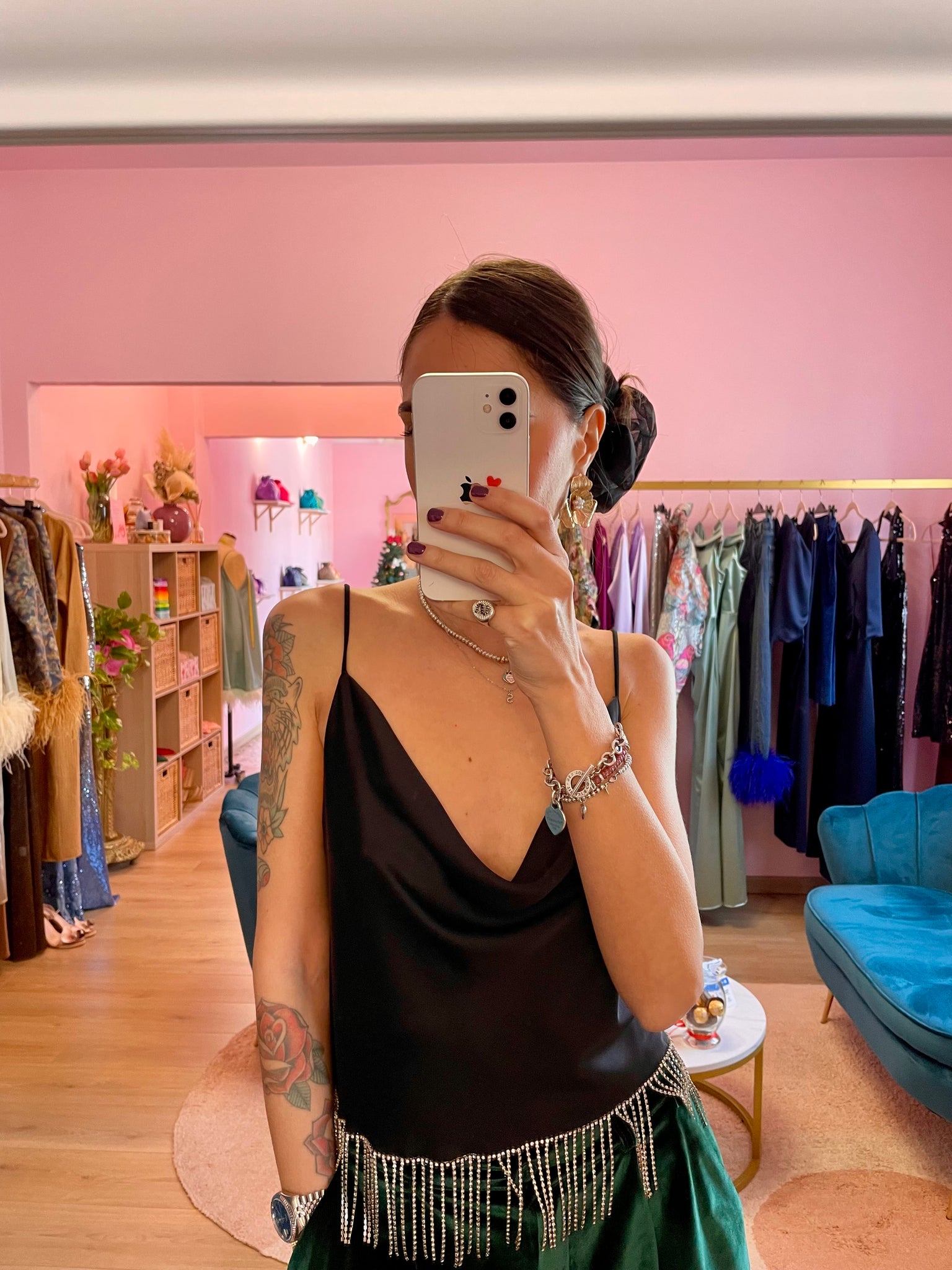 Top nero in raso "Venus" (modello sartoriale by Jupes and more) con scollo ad anello, spallini sottili neri elastici con frangia strass cucita a mano.